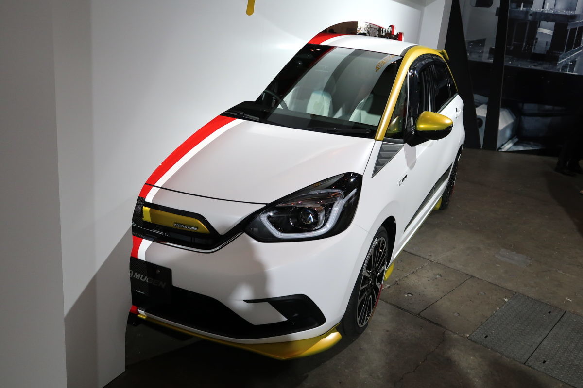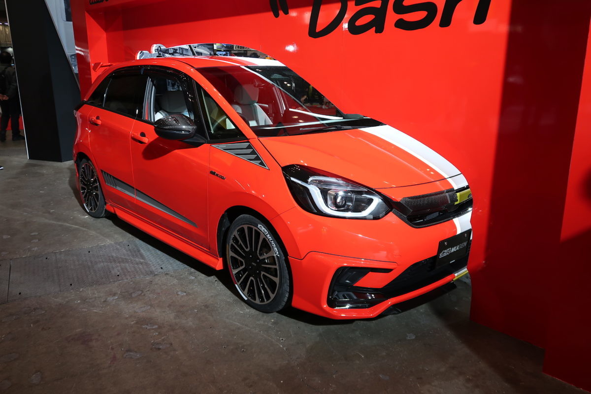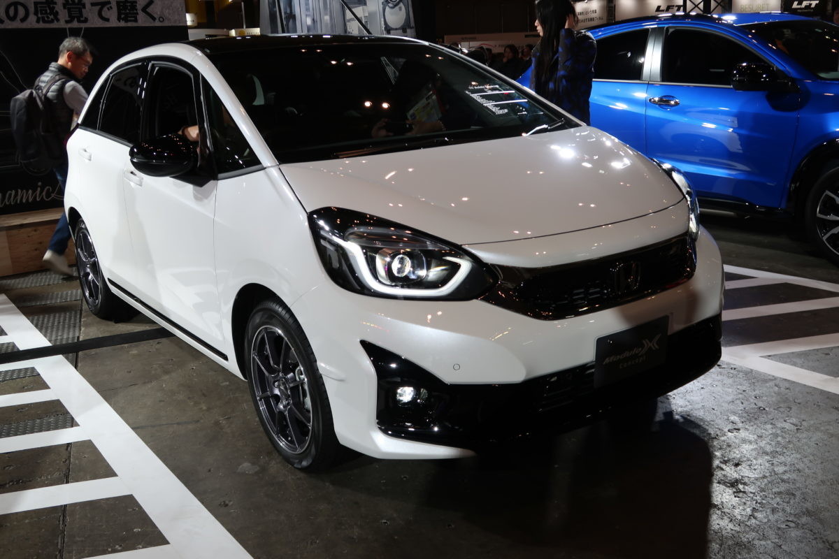 「フィットモデューロXコンセプト」。ホイール、バンパー、フロントグリルなどのエクステリアを始め、各部に手が入ったコンセプトモデルです。よりクリーンなデザインでスポーティに見えます。モデューロXなので、スタイリングだけに留まらず各部の強化によりシャッキリとした性能の向上が期待できます。