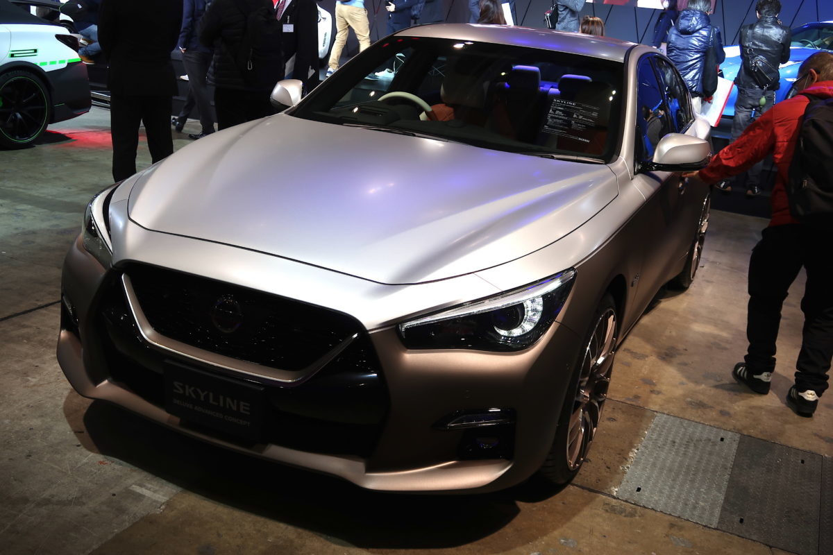 この渋いスカイラインは「スカイライン デラックス アドバンスド コンセプト」と呼ばれる豪華仕様のコンセプトカーです。マットブラウンとマットシルバーのツートーンカラーはリアドアの所でプレスラインに合わせ一度折れ返っています。これはかつてのスカイラインの伝統的デザインアクセントだったサーフィンラインを表しています。大人っぽい色合いの中にすごみを利かせた重厚な雰囲気が出ています。