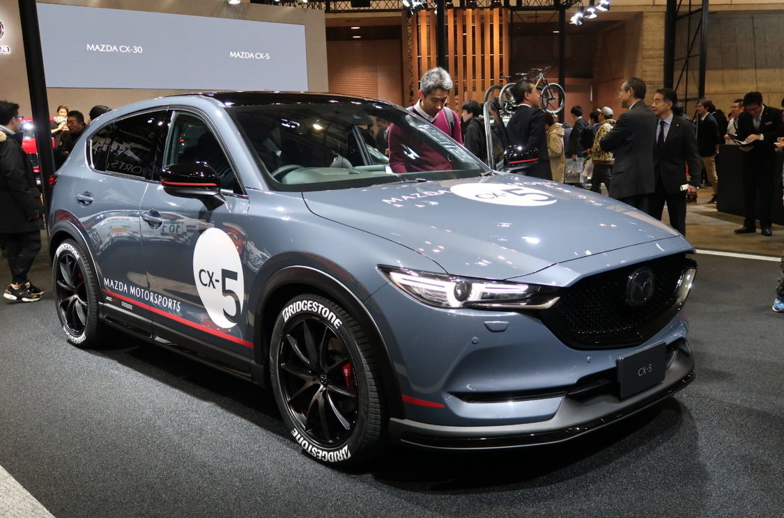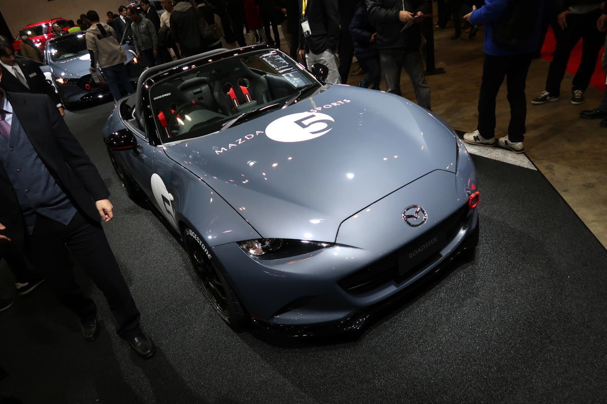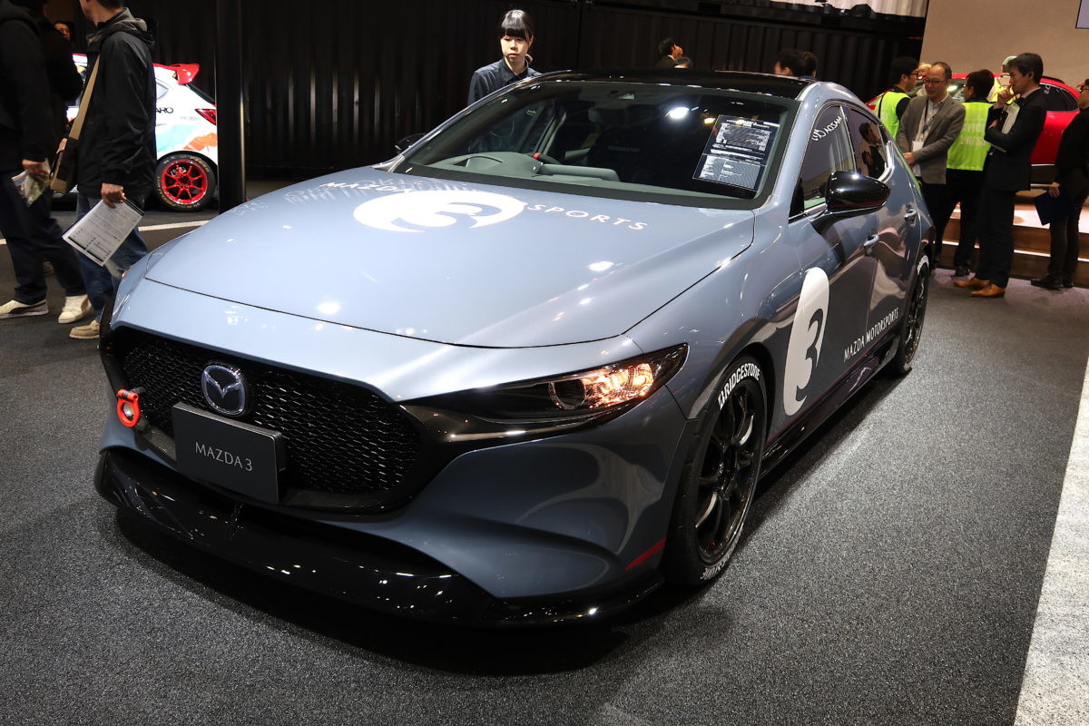 マツダブースではSUVシリーズのアクセサリーパッケージとモータースポーツをイメージして仕立てた「ロードスター」、「マツダCX5」、「マツダ3」に注目しました。渋めのグレイッシュブルーに塗装され、ゼッケンサークルが貼られ、イメージを統一した3台。ジャンルの違うはずの3台が統一感を持って並んでいると、なんともかっこよく、ガレージの中にこんな3台を入れてみたくなります。