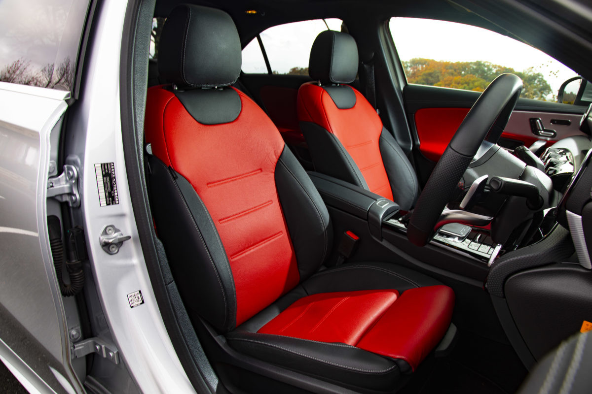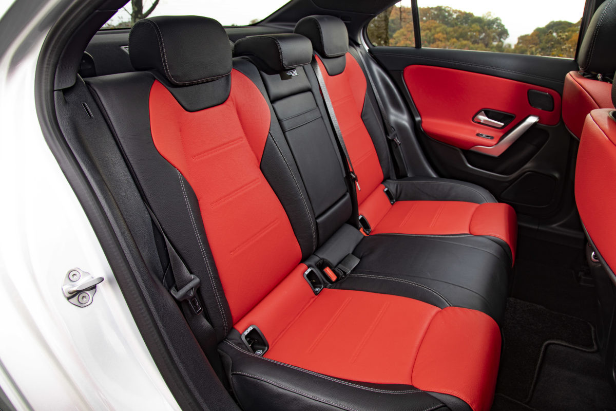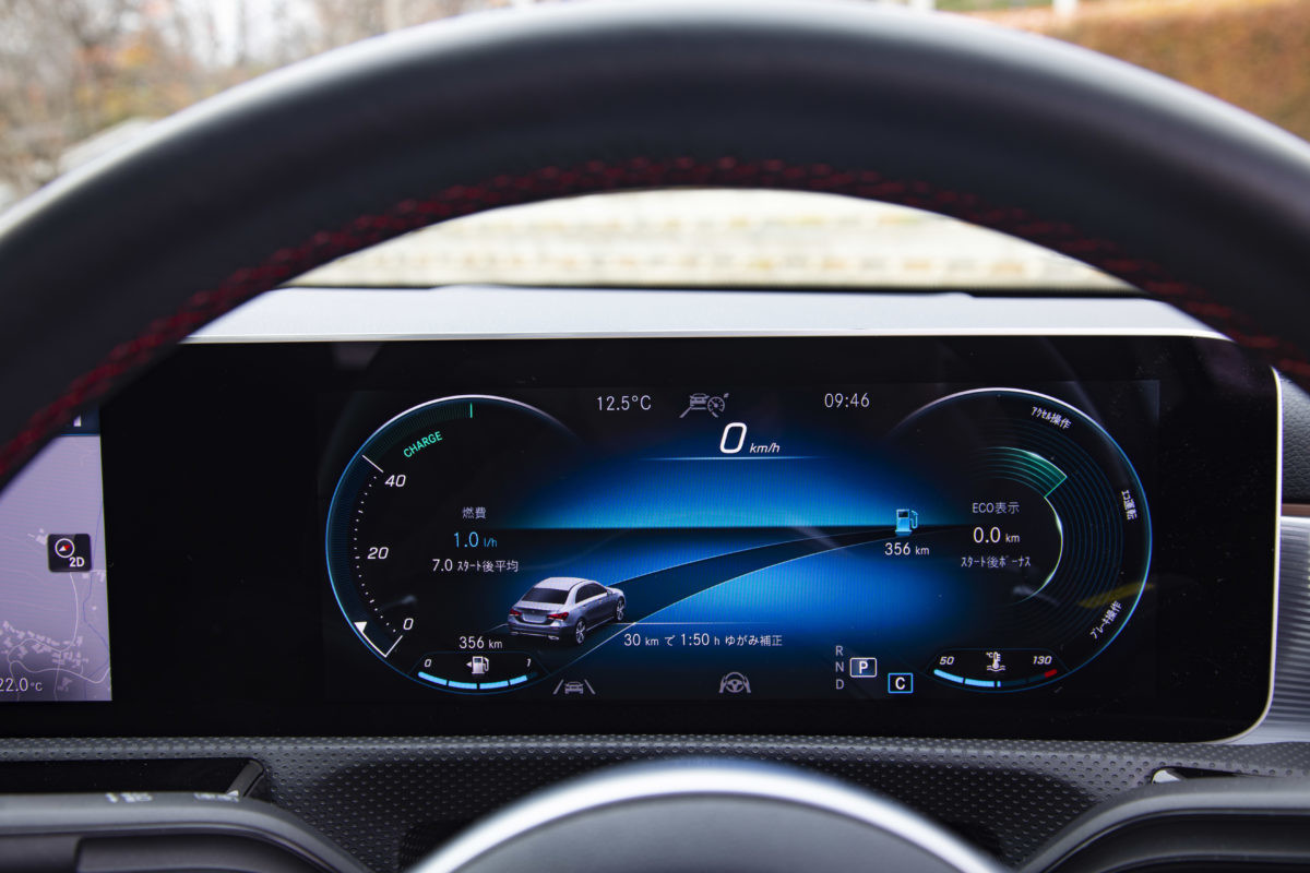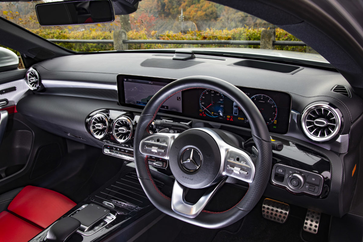 一方、室内ですが前席の仕立てはハッチバックのAクラスと基本的に同じ。タブレットを並べたようなメーター回りや、凝ったデザインのエアコンルーバーは最新メルセデスの文法通り。完全に画像化されたメーターが多彩な表示機能を誇る点はセダンでも変わらず、もちろん対話型インターフェイスの「MBUX(メルセデス・ベンツ ユーザー エクスペリエンス)」も装備されています。