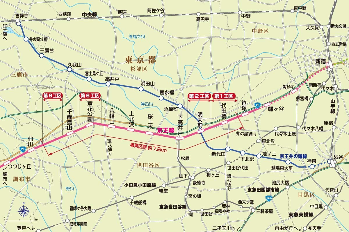 ↑笹塚駅〜仙川駅間の事業区間約7.2kmのうち、第1・第2そして第6・第8工区の工事が先に進められている