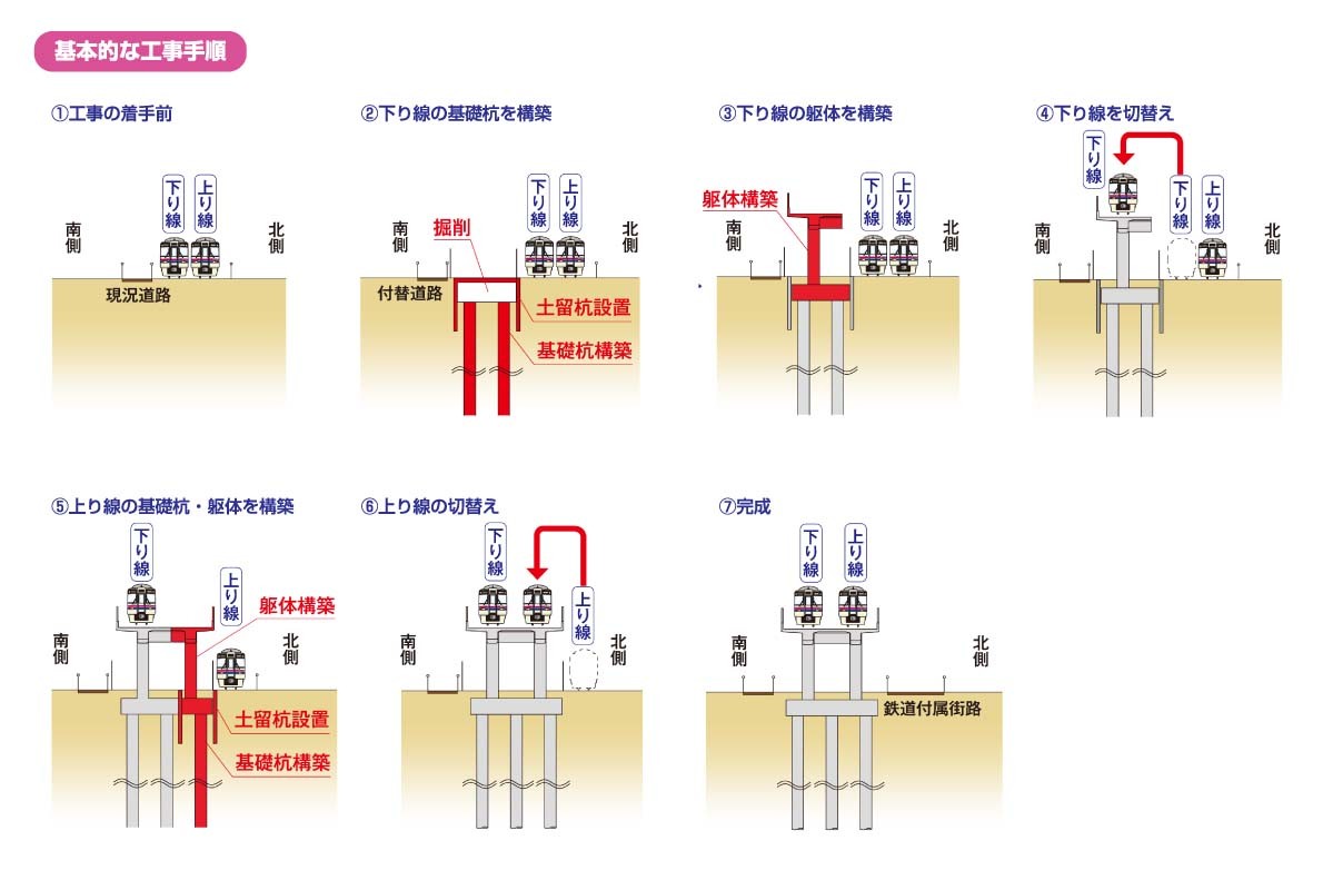 さらに基礎杭、土留杭で基礎がためした上に③下り線の躯体(高架橋の構造物)を立てる。そして④地上を走っていた下り線を高架上に移動させる。⑤〜⑥は下り線と同様、上り線も同じ工程の工事となる。完成後には路線跡は街路として利用される。