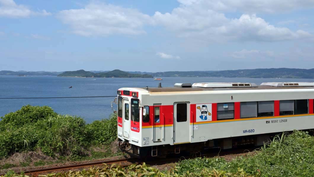 車窓から最も海景色が楽しめるのは、この調川駅の隣、前浜駅と鷹島口駅(たかしまぐち)の間だ。並走する国道204号よりも海側に線路が通ることもあり玄界灘と、沖に浮かぶ、飛島や鷹島などの島影が良く望める。