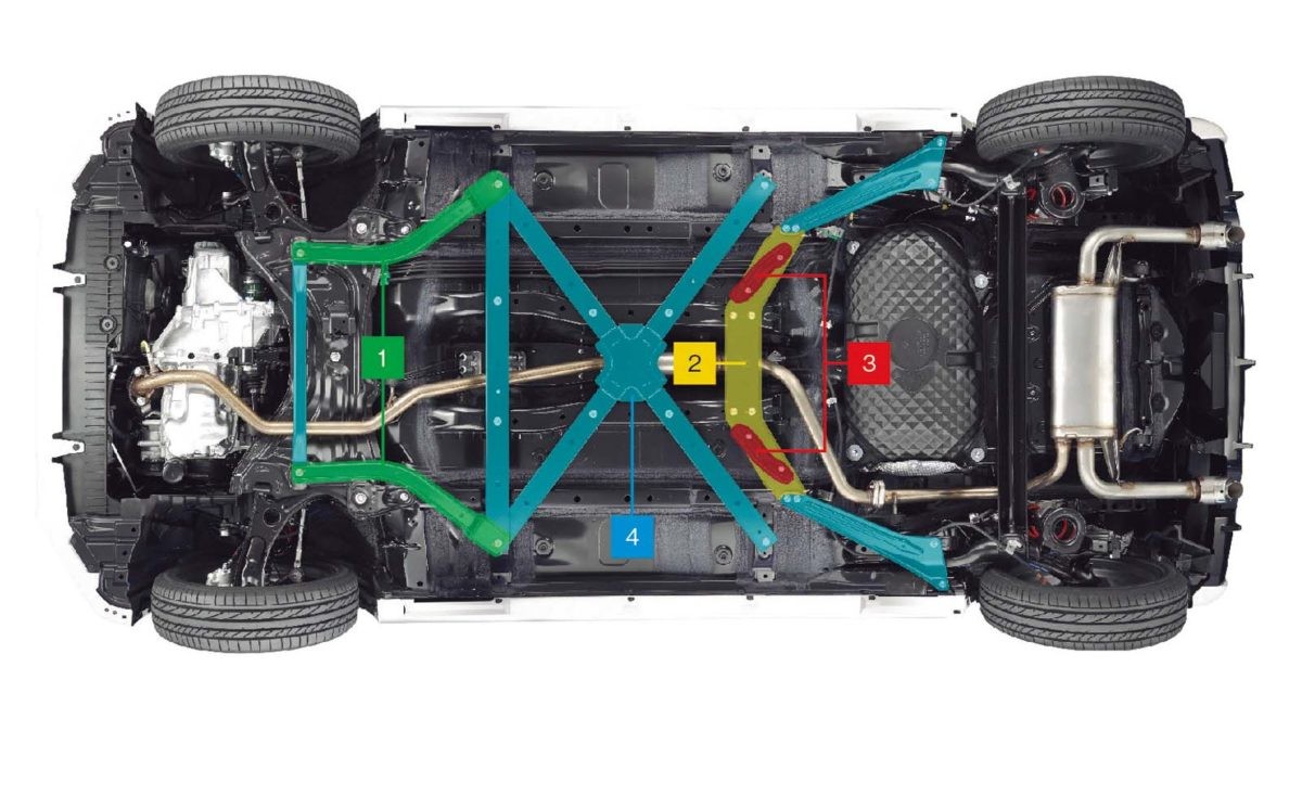 フロントブレースやセンターブレースといった、板のようなパーツがボディ下にいくつか追加されています。これによりボディの剛性、つまり頑丈さが強化され、しなやかで接地感のある走りを実現しているのです。