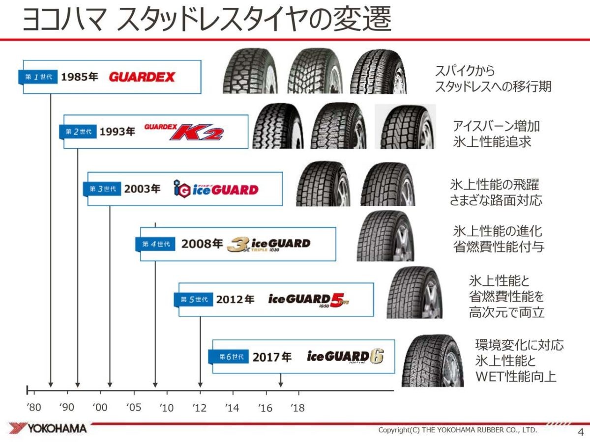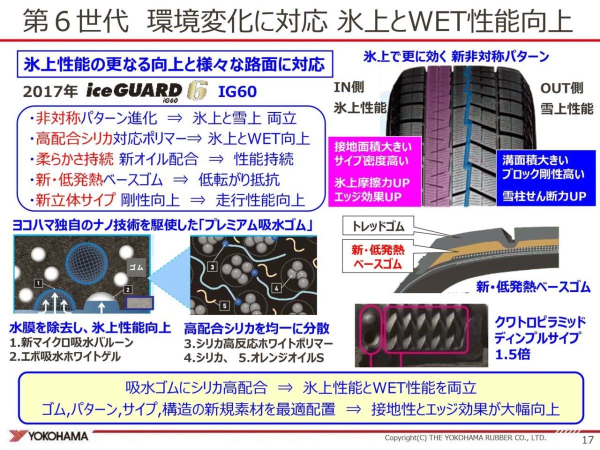 2008年~2010年頃に登場した第4世代になると温暖化による氷雪路減少を背景に、氷雪路面でのグリップ力を確保しつつドライ路面でのウェット性能を意識した製品が登場。2012年~2015年には、氷上性能と転がり抵抗低減を目指すことで、氷上性能と省燃費性能の両立を図った第5世代が登場します。そして、2017年には現行の第6世代アイスガード6が登場し、あらゆる環境変化に対応した上で、氷上性能のさらなる向上を図るスタッドレスタイヤの実現へとつながったのです。