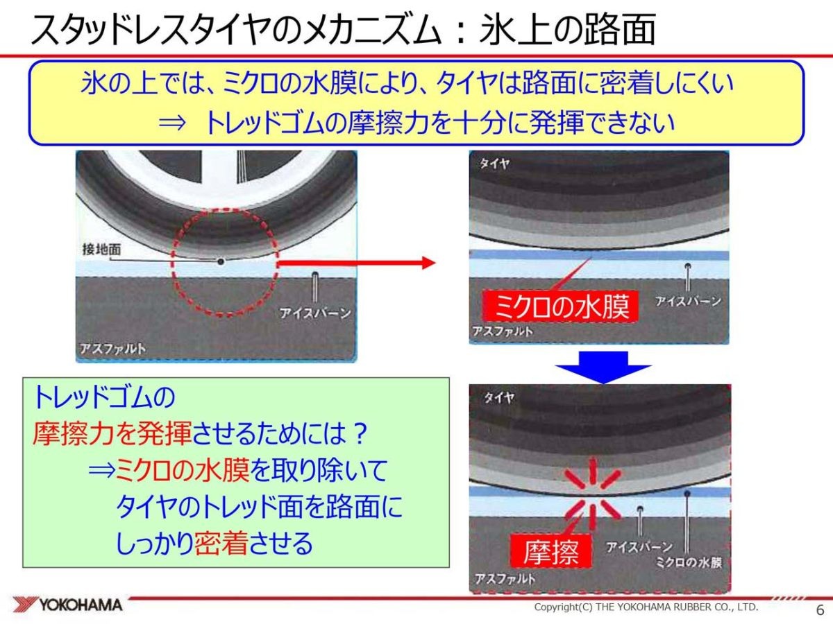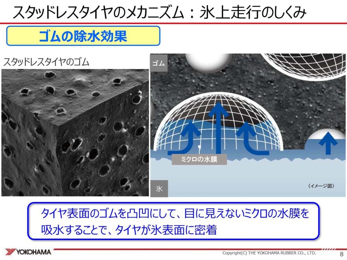 実は氷の上でタイヤがなぜ滑るのかといえば、凍った路面にタイヤが乗ると、その部分だけ氷が溶けて路面とタイヤの間に水膜ができ、その上をタイヤが滑るからです。それに対してブリヂストンは、気泡を含んだゴムにこの水を吸い込ませることでグリップ力を確保しました。