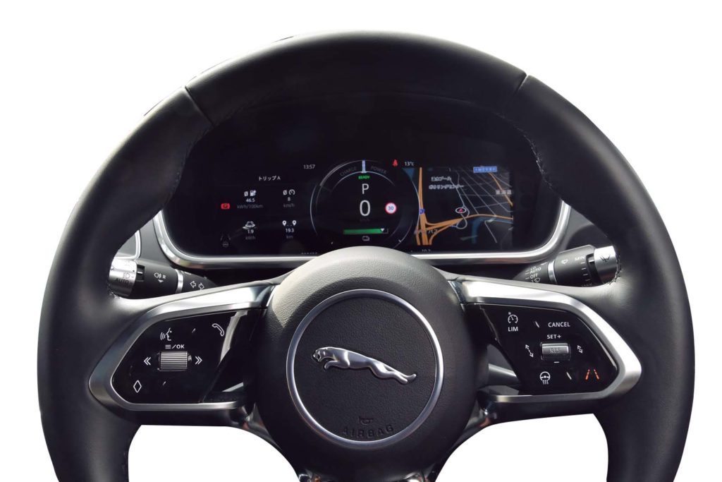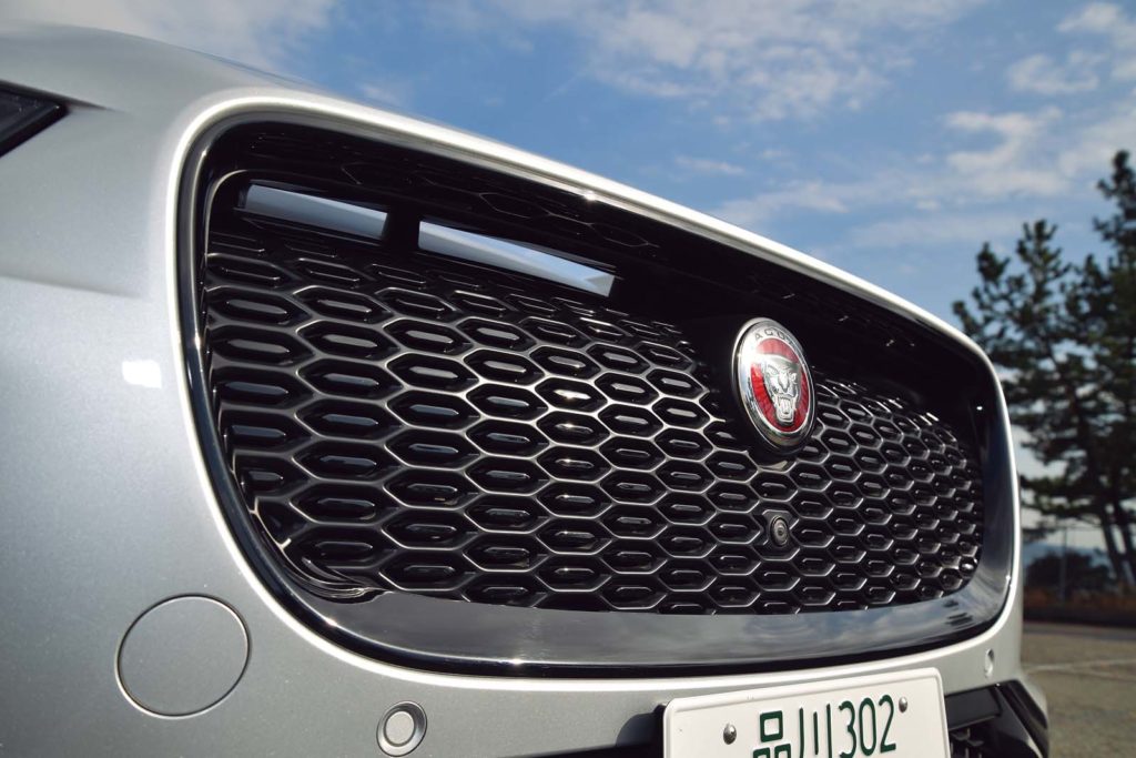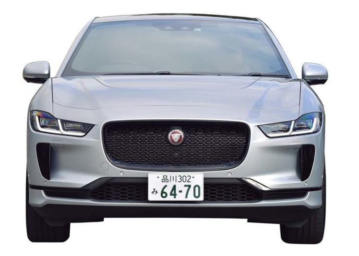 薄く鋭利なライト形状は、大口径のフロントグリルとともにスポーティな雰囲気を演出しています。ジャガーのガソリンエンジン車と違ってボンネット部分は短いのですが、この表情(フロントデザイン)が“ジャガーらしさ”を強調しています。