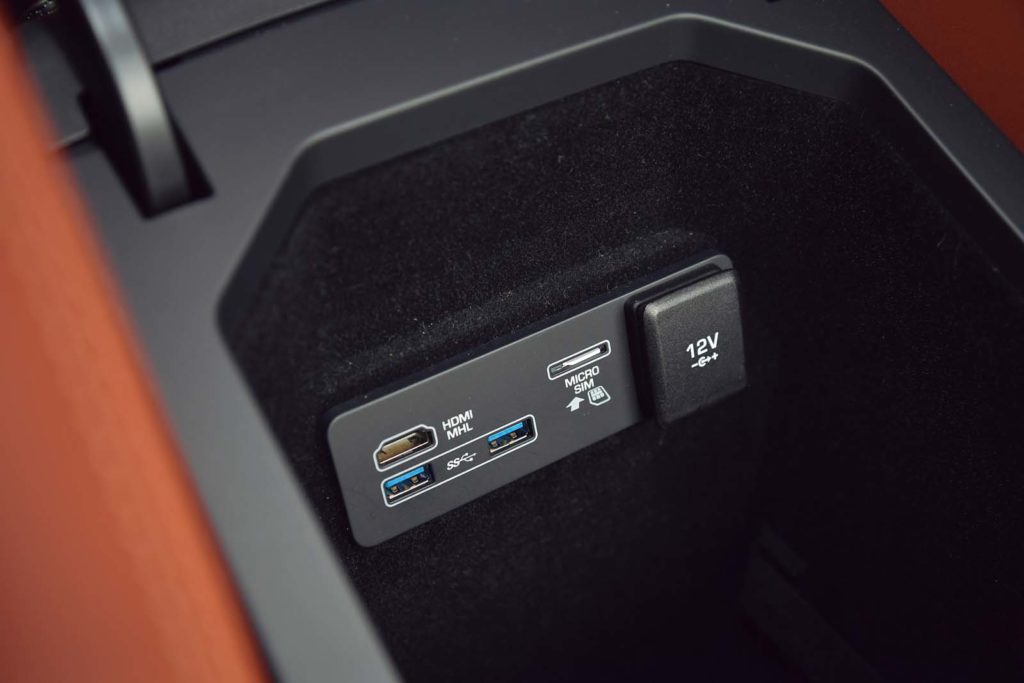 今回の試乗車両では、センターコンソールに設置されたアームレストの内部に様々な端子類が設置されていました。12Vのシガーライターソケットはもちろん、USBが2基、マイクロSIMやHDMIまで! 拡張性が広がります。
