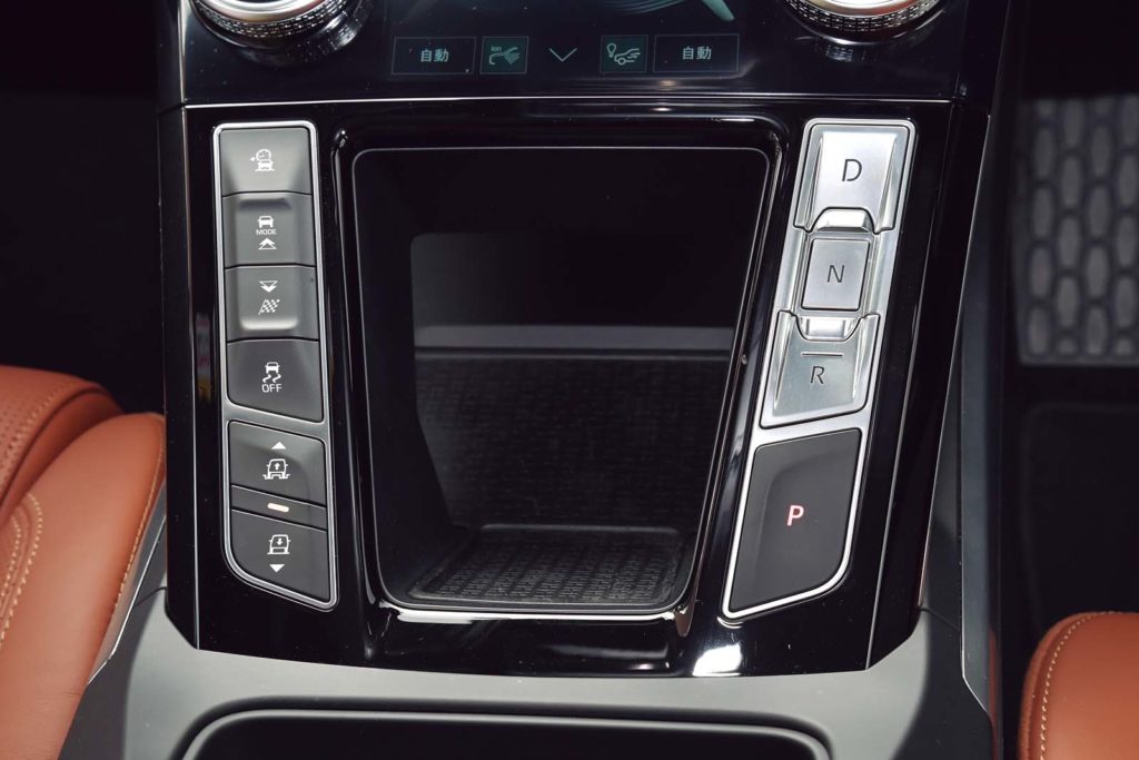 インパネ下部の2本の柱には、走行関連のスイッチが並びます。左側には各種走行モードや車高調整スイッチが配置されていますが、なんと右側にはボタン式のシフトセレクターが! 慣れるまでシフトノブを探してしまいます。