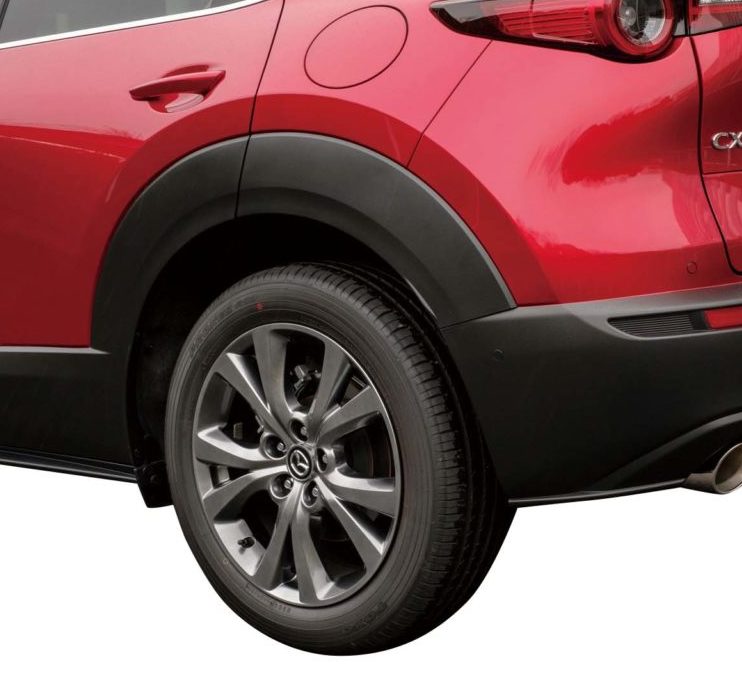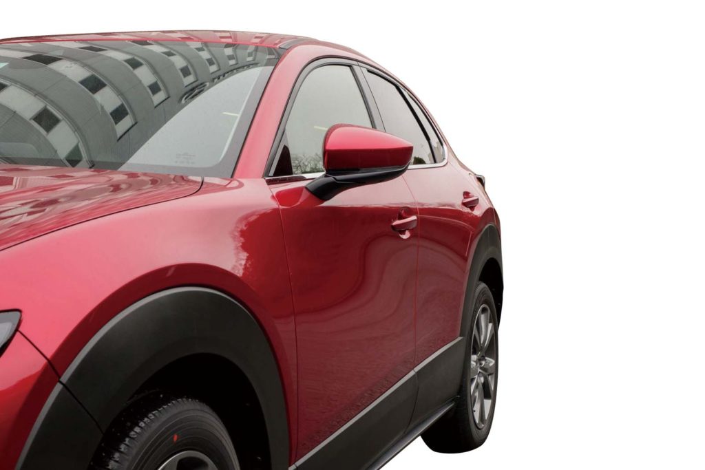 マツダ3をベースに設計されたCX-30ですが、ボディサイドパネルは、マツダ3とはまた違った面持ちで美しくまとめられています。ハッキリとしたキャラクターラインがなく柔らかい面の表情で表現しているのは同様ですが、CX-30はフロントドアからリアドアにかけてSの字が浮かび上がるような造形になっていて、前後方向への伸びやかさが感じられます。