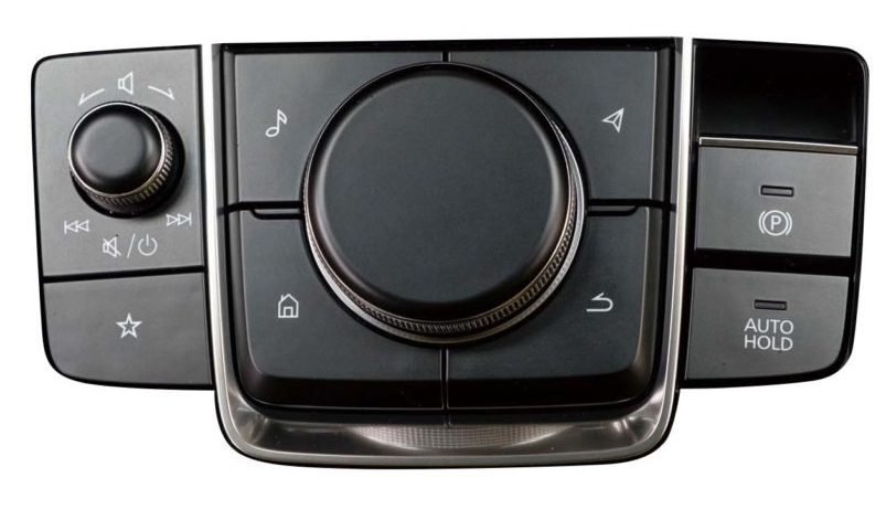 運転席と助手席の間、センターコンソールのシフトノブ後方には、このようにボタン類が整然と配置されています。真ん中のダイヤルをグリグリ回してカーナビやら何やらを操作できます。ひと昔前は、輸入車に多かったものです。