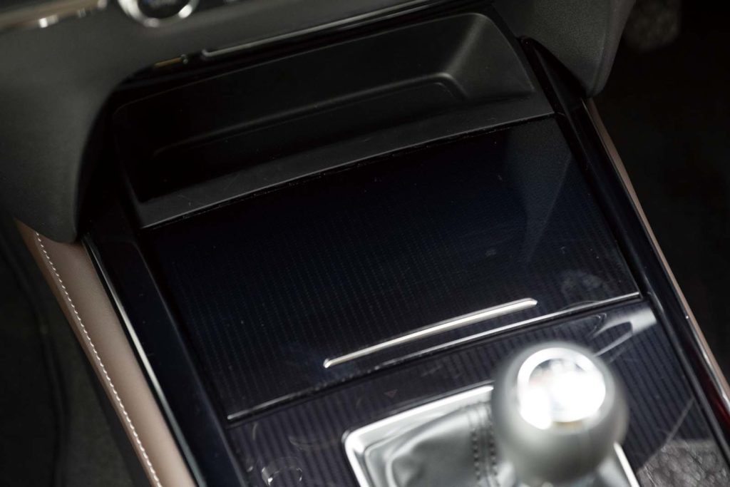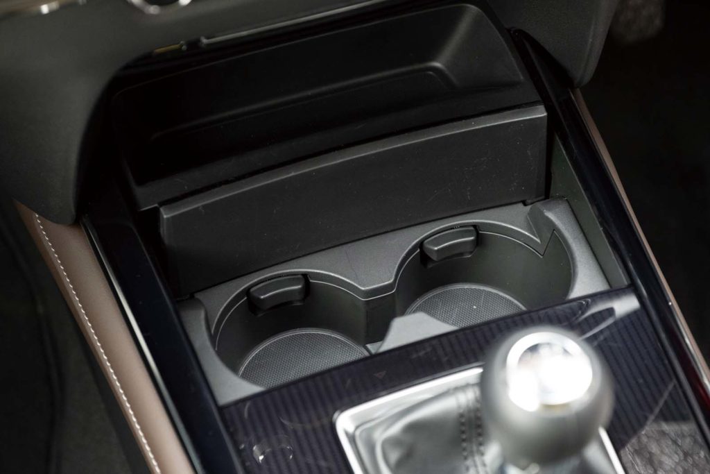 CX-30は、エクステリアだけでなく、インテリアもとても質感高くまとめられています。シフトの前方に設置されたカップホルダーも、まるで高級車のような分厚いフタが付いていて、実に“ゆっくり”と開きます。この“ゆっくり”が優雅さを感じさせます。