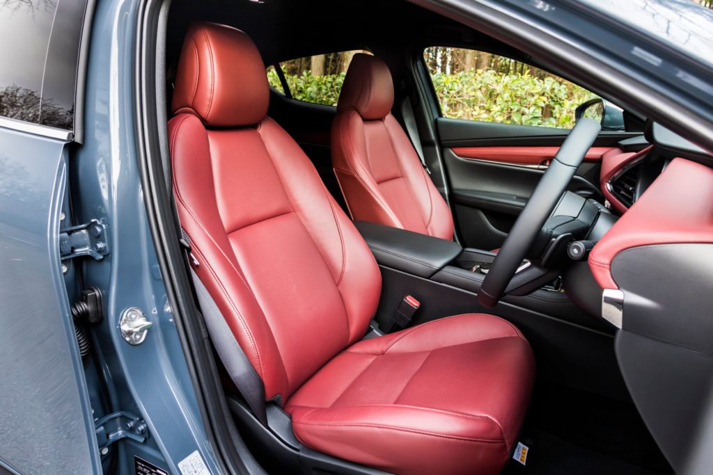 その排気量は2Lで、アウトプットは最高出力が180PS/6000rpm。最大トルクは224Nm/3000rpmというもの。スカイアクティブXでは、これにマイルドハイブリッドシステムを組み合わせ、電気モーターによる6.5PSと61Nmのアシストも適宜加えられます。ちなみに、マツダ3には1.5Lガソリン(ファストバックのみ)と2Lガソリン、そして1.8Lクリーンディーゼルターボもラインナップされていますが、それぞれのパワー&トルクは順に111PS&146Nm、156PS&199Nm、116PS&270Nm。エンジン単体では最大トルクこそディーゼルに及びませんが、それ以外はスカイアクティブXが一番ハイスペックとなっています。また、ディーゼルの最高出力と最大トルク発生回転数はそれぞれ4000rpmと1600~2600rpm。このことからも、スカイアクティブXの方が格段に高回転を許容する構造であることは明らか。それを反映してか、ファストバックのスカイアクティブX仕様ではATだけでなく6速MTが選べるところもマニア的には要注目ポイントといえるかもしれません。