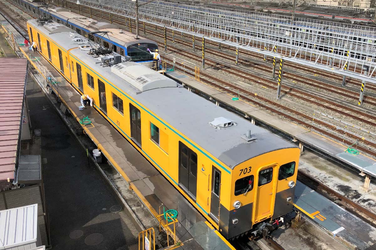 モヤ700形は7000系から改造された事業用車両。架線検測設備を搭載した701+702編成と、救援用大形ジャッキを装備する703+704編成の計4両が用意されている。検測作業の時には、4両で運行される。黄色一色で見ることが出来たら幸運とばかり、「幸せの黄色い電車」と呼ばれることもある。