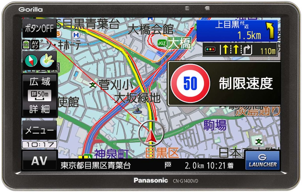 もちろん、ゴリラならではの充実したルート案内機能や、ドライブ中のヒヤリハットを注意喚起する安全・安心運転サポート機能はしっかりと搭載しています。ルート案内ではリアルな交差点拡大図やピクトグラムに対応した方面案内看板(東京都の一部エリアが対象)、リアルな3D交差点拡大図など、充実した案内機能を標準装備。安全・安心機能としては、うっかり見落としがちな道路標識情報や逆走を検知して警告する機能を備えています。さらに別売のリアビューカメラにも対応(G1400Vのみ)するなど、その充実した機能はどのスマートフォンよりも上回っていると見て間違いないでしょう。