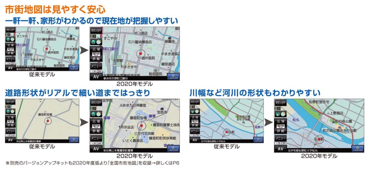 その最も大きなポイントとなっているのが全国の市町村1741エリアすべてを市街地図でカバーしたことです。従来モデルでもリアルな道幅の反映は全国で実現できていましたが、家の形状(家形図)が一軒ずつ地図上に表示できる市街地図は1295エリアにとどまっていました。それを2020年モデルでは全国すべての市町村にまで広げたのです。これはカーナビゲーションとしては初の対応になります。
