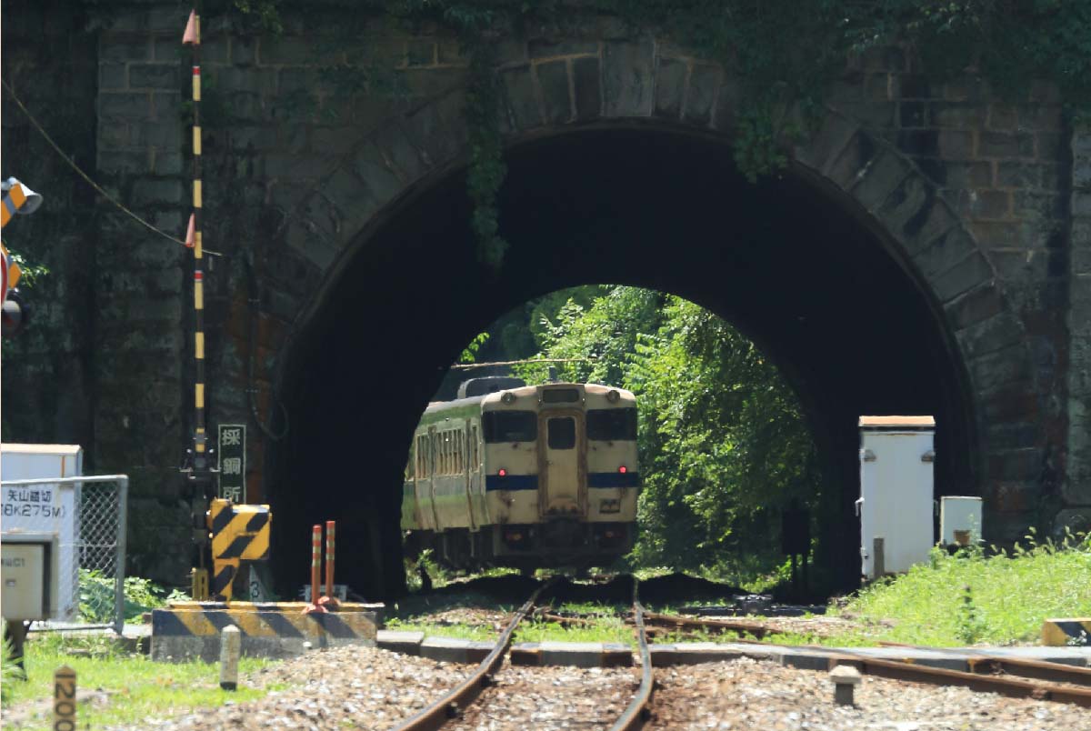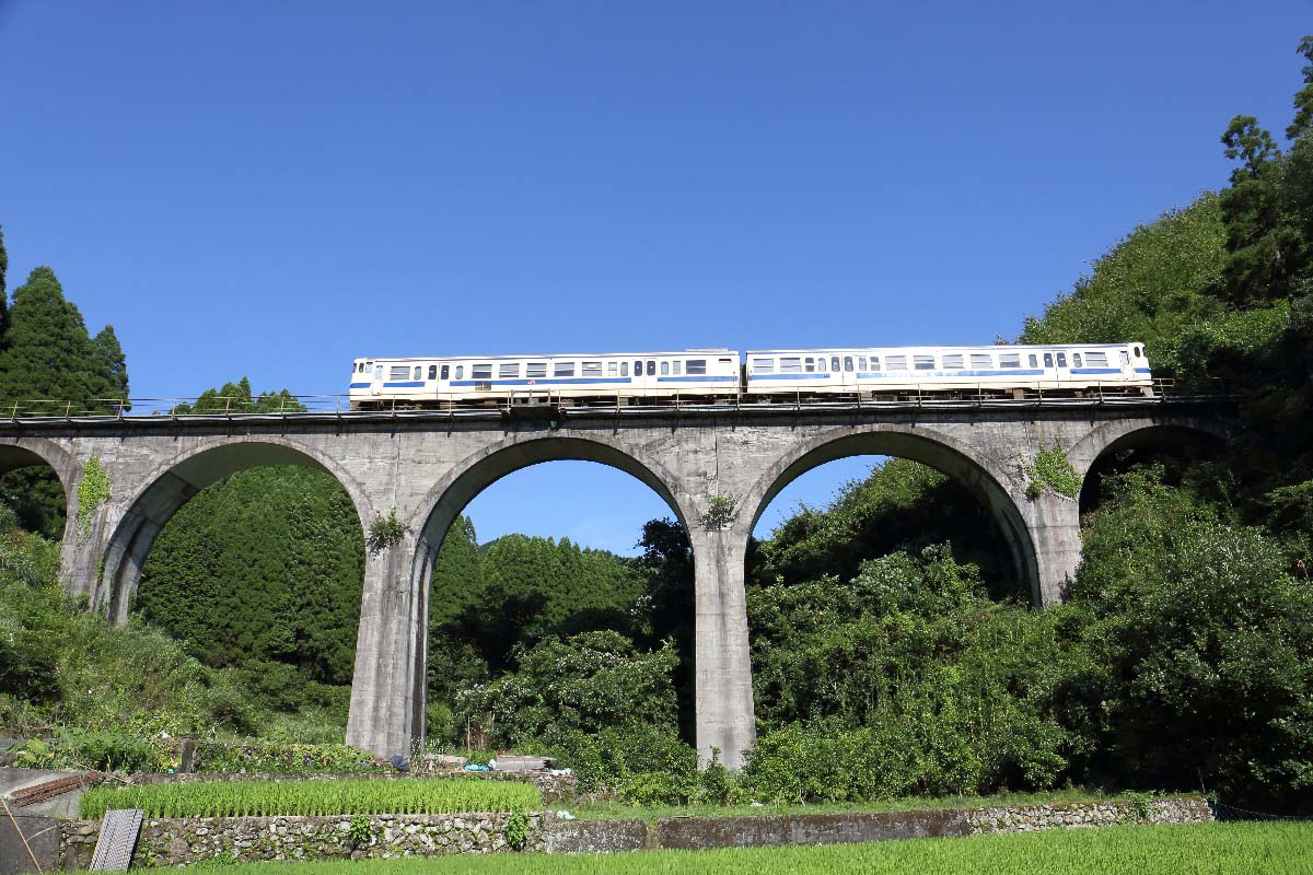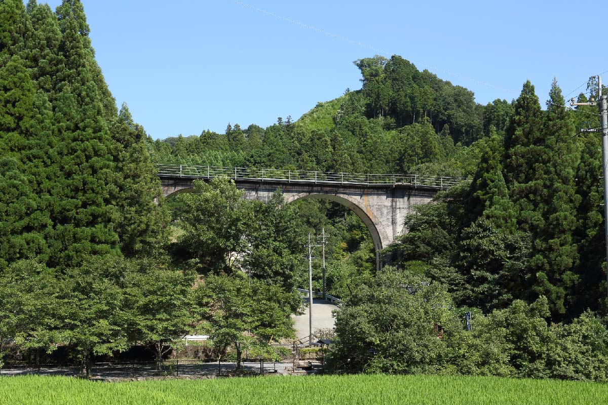 棚田を見下ろす間に列車は3つの橋を渡っていた。地元では「めがね橋」とよび親しんできたコンクリート製のアーチ橋だ。この橋りょうはみな、太平洋戦争の直前の1938(昭和13)年に着工されたもの。当時は日中戦争が始まった時期ということもあり、鉄需要がひっ迫していた。そのため、鉄を満足に使うことができなかった。3つの橋はそのため「無筋コンクリート充腹アーチ橋」と呼ぶ構造をしている。
