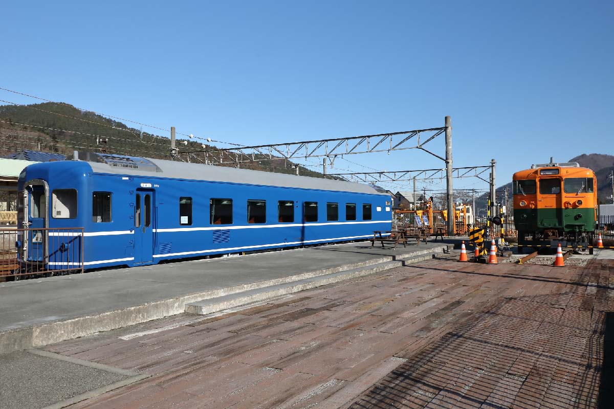 鉄道好きとして下吉田駅で気になるのは、保存される車両群であろう。まずブルートレインテラスと名付けられたスペースには国鉄形14系客車と急行形電車169系の先頭部分が保存展示されている。14系客車には寝台特急「富士」のマークが付けられる。富士つながりで、同駅で保存されることになった。同車両は、富士のマークが掲示されているが、実は上野駅〜金沢駅間を走るブルートレイン寝台「北陸」に使われた14系客車だった。