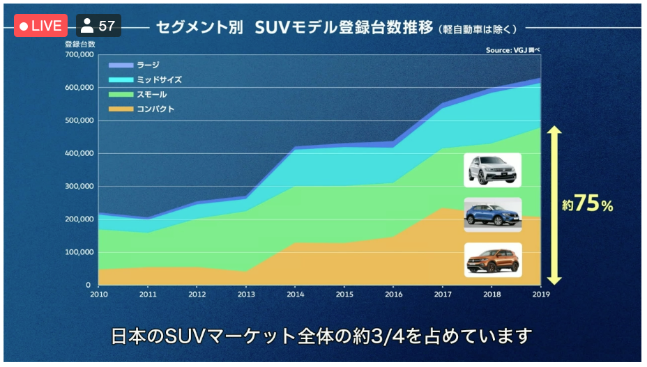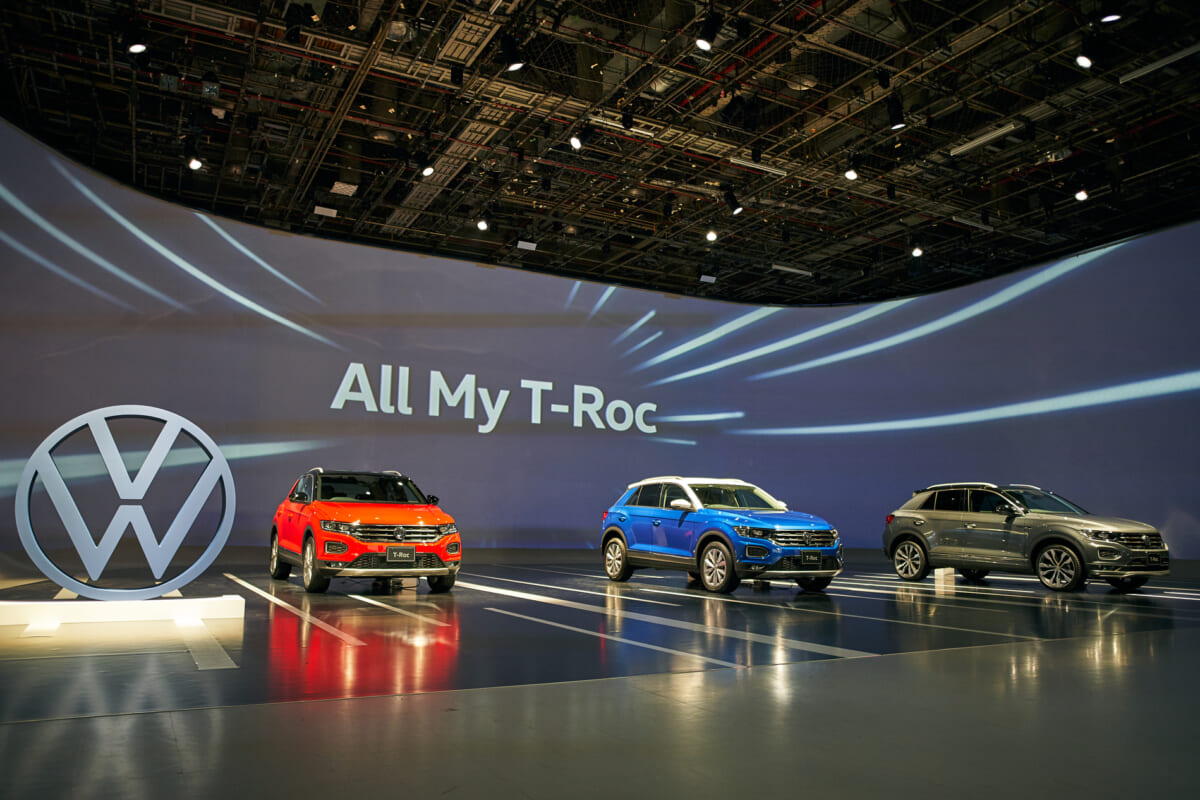 ステージ上にはVWの新ロゴと4グレードのT-Rocが置かれ、ティル・シェアCEOのプレゼンテーションが始まりました。「T-Rocの登場によって、VWのSUVラインナップが完成となりました。T-RocはクロスオーバーSUVの新機軸となっていくものだと考えています。日本のSUVマーケットの約3/4を占めるのがスモール/コンパクトセグメントであり、VWとしてもそこに焦点をあてました」。