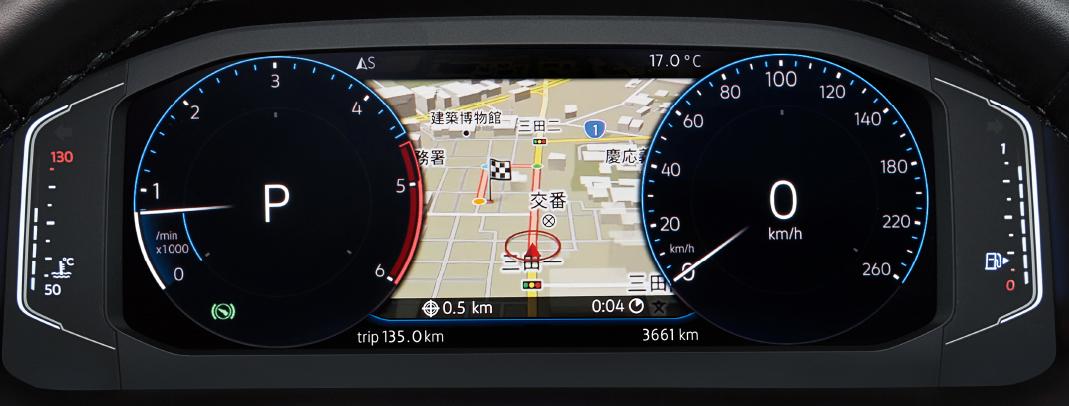 インテリアは2590mmのロングホイールベースを活かし、乗員5人に対し十分な室内空間を提供。各種メーター類を水平に配置することで、運転中の視線移動を少なく自然に行えるよう設計されています。また、VW純正インフォテインメントシステムの「ディスカバープロ」とデジタルメータークラスター「アクティブインフォディスプレイ」により、インテリアの洗練度がアップ! ハンドル右のスポーク部にあるボタンで、アクティブインフォディスプレイに表示する情報を選択できます。メーター、カーナビ、車両の情報などをあらかじめ設定することで欲しい情報が見やすい場所に表示できるのです。