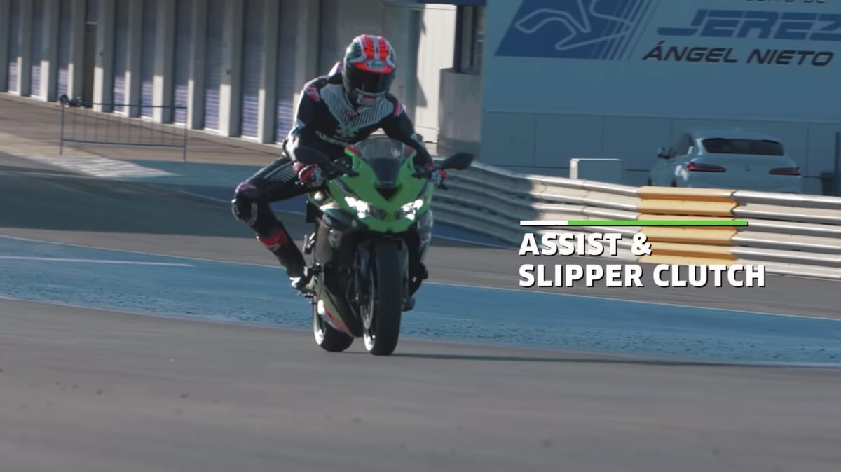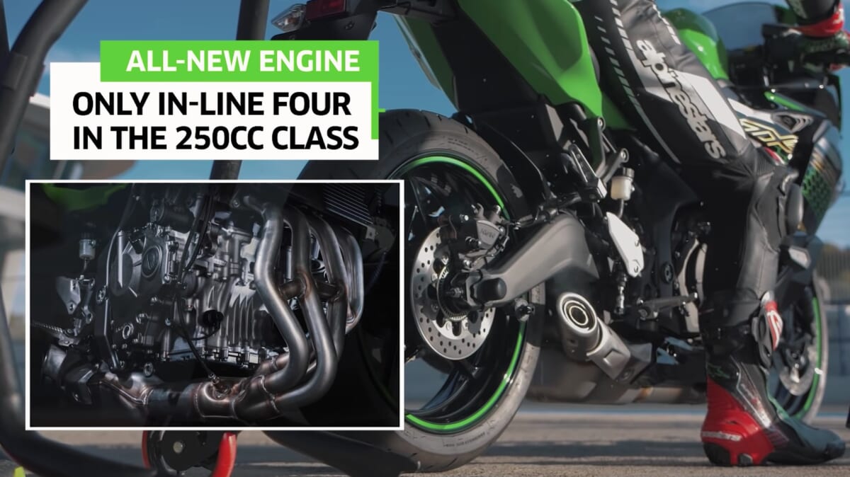 これまでのツインモデルの最高出力27kW(37PS)/1万2500rpmでも十分にパワフルでしたが、4気筒モデルはさらにパワーアップしました。しかも発生回転数が1万5500rpmという高回転型で、ラムエア加圧時は34kW(46PS)に増加します。カワサキのワークスライダー=ジョナサン・レイによるプロモ映像を見ると、速さにも音にも別次元の魅力を見せつけられてしまいます。これこそが4発の圧倒的な魅力です。