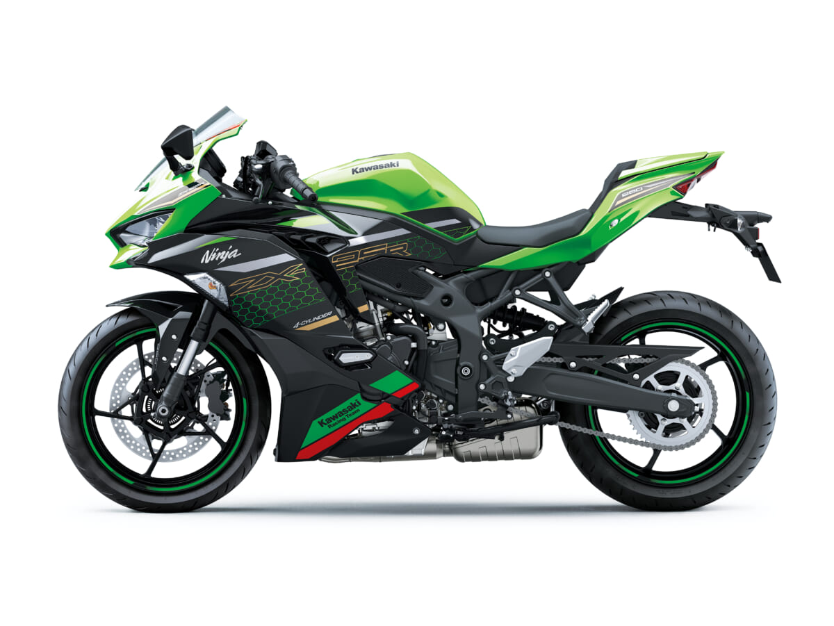 ↑「Ninja ZX-25R SE KRT EDITION」ライムグリーン×エボニー(シングルシートカバーはオプション)。価格は91万3000円(税込)