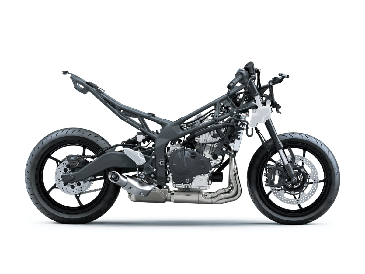 新設計のフレームは高張力鋼製トレリスフレームです。スーパーバイク選手権に参戦しているNinja ZX-10RRレーシングマシンのシャーシ設計思想を踏襲。それによって理想的な剛性バランスとディメンションを作り上げています。
