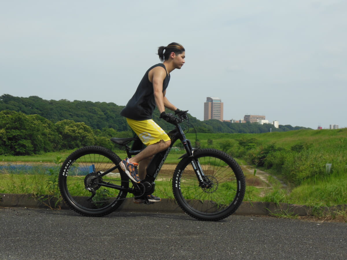 今回の試乗では地面が柔らかい草地を選んでみましたが、トルクフルなアシストによりパワーをロスすることなく走り回ることができました。また、同モデルには前後共にディスクブレーキが装備され確実な制動力を実感。急勾配のダウンヒルでも姿勢を乱すことなくゆっくりと下ることができるのはアウトドアシーンでは重要なファクターでしょう。