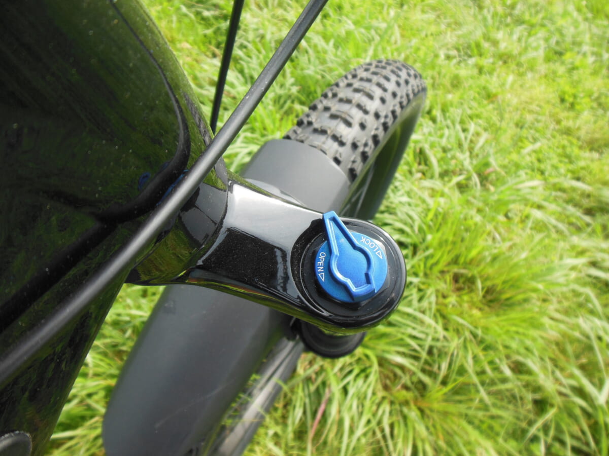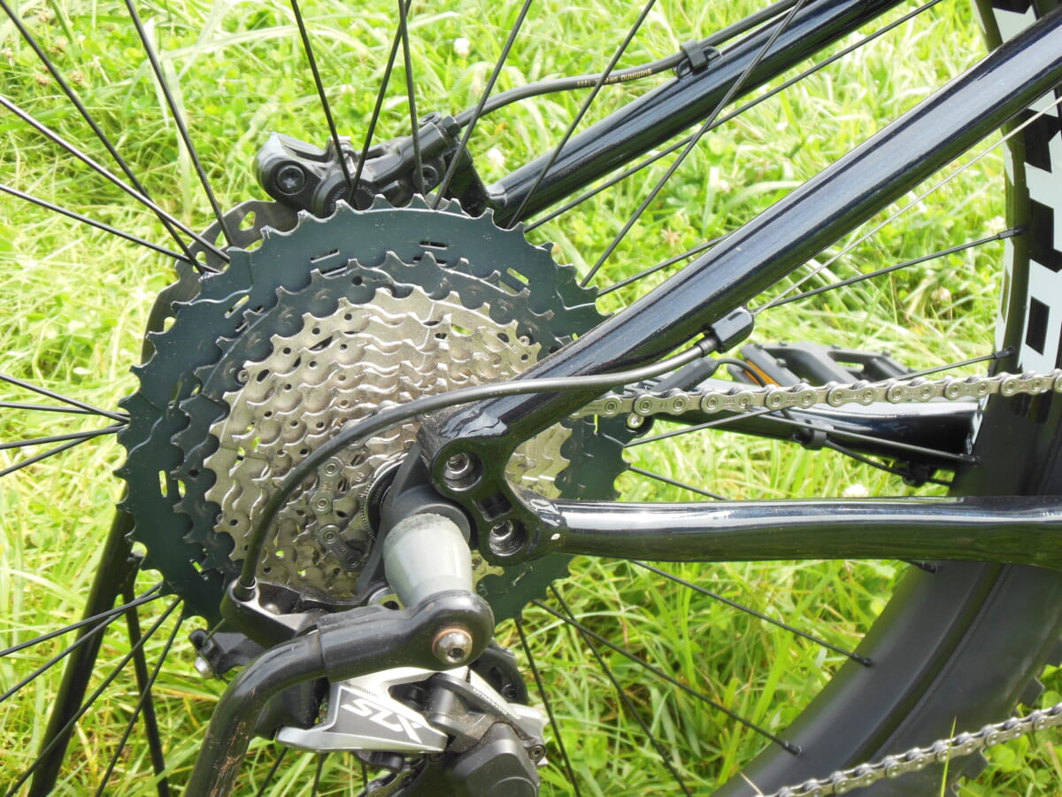 アスファルト路面ではパターンノイズが大きく感じるものの、泥濘や草地などのフィールドでは大きな味方になってくれます。また、アシストを上手に使うためにはギア選択も重要になりますが、シマノ製の11速ギアはワイドレシオな設定となり、軽いギアを使って勾配のきつい上り坂も軽々と走り抜くことができました。変速はハンドルバーの右手側で行い、グリップを握りながら親指と人差し指で行うタイプ。操作感も軽く荒れた路面でも戸惑うことはないはずです。