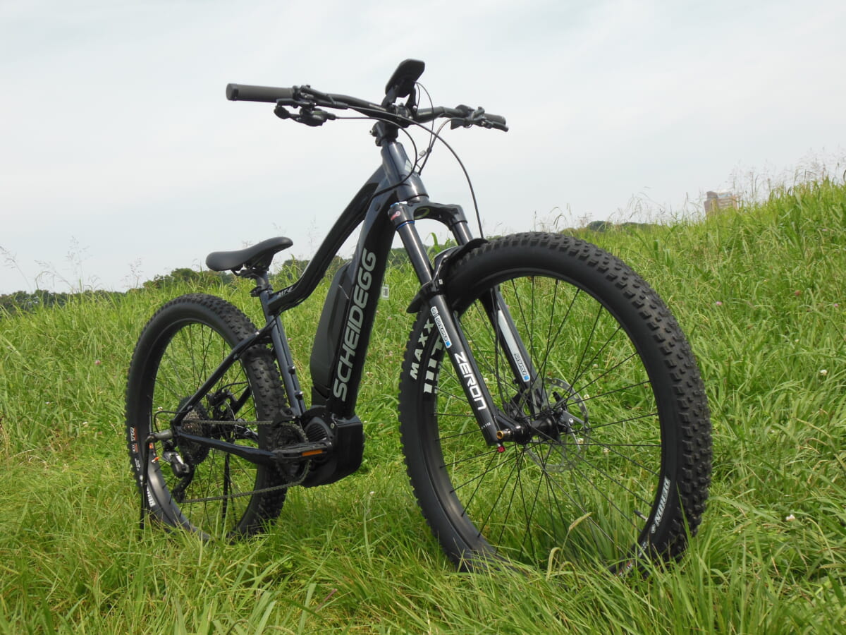 試乗へと連れ出したMT-Eの存在感は、素晴らしいのひと言。まず、目を惹くのがファットなタイヤ。フロントサスペンションを備えたフレームは太めのデザインですが、それに負けない27.5インチの2.80という極太のブロックタイヤは電動アシストを武器に荒れた大地をグリップします。