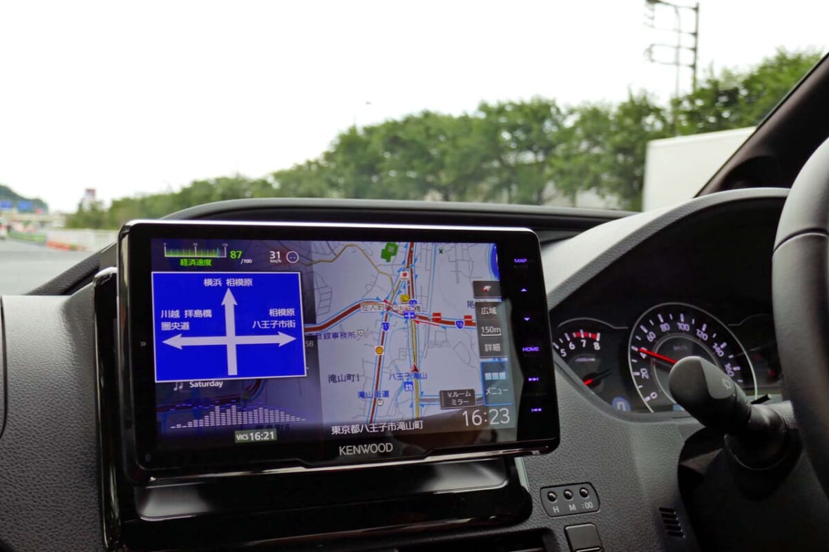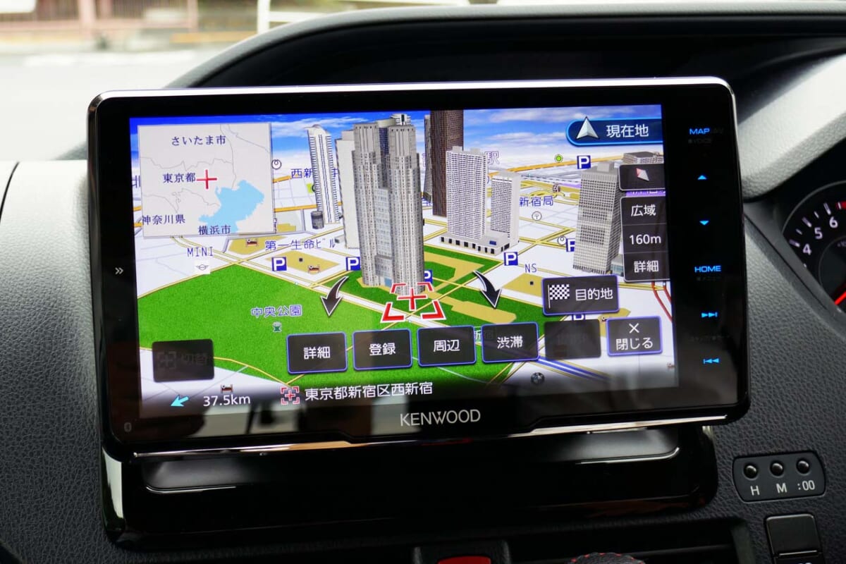 試乗車に取り付けられたMDV-M907HDFを見ると、その画面サイズに圧倒。9インチの画面サイズもさることながら、ディスプレイがダッシュボードから浮いた状態にあるため、よりビッグな印象を受けるのです。