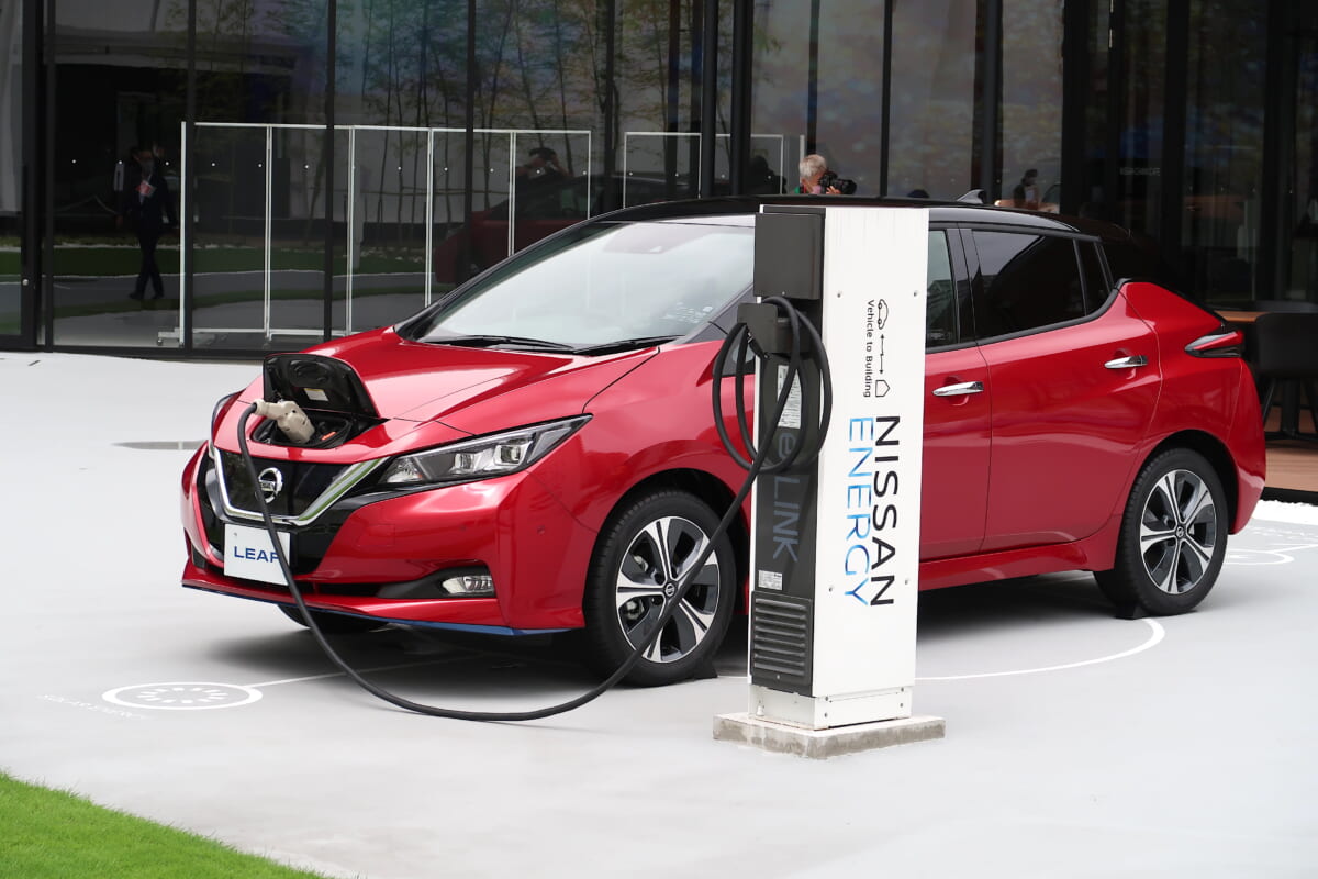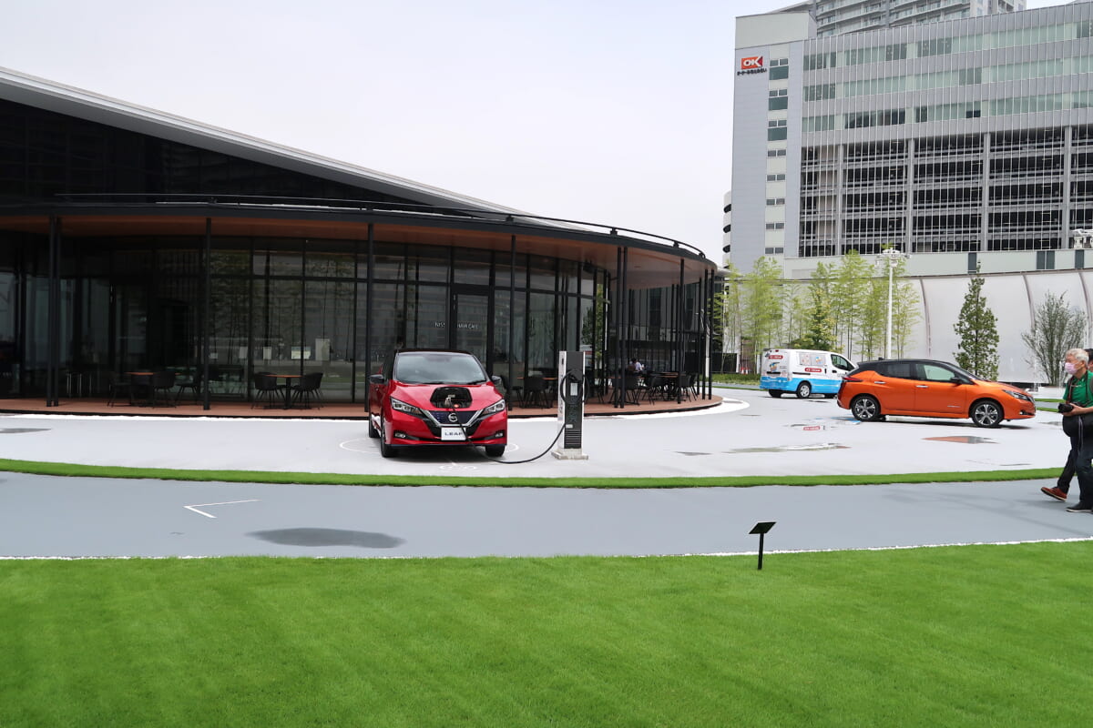 またパビリオンでは、カフェの屋根に設置された太陽光パネルで発電した再生可能エネルギーを「リーフ」に蓄電し、そのリーフに溜めた電力をカフェの一部の電力として使用しています。