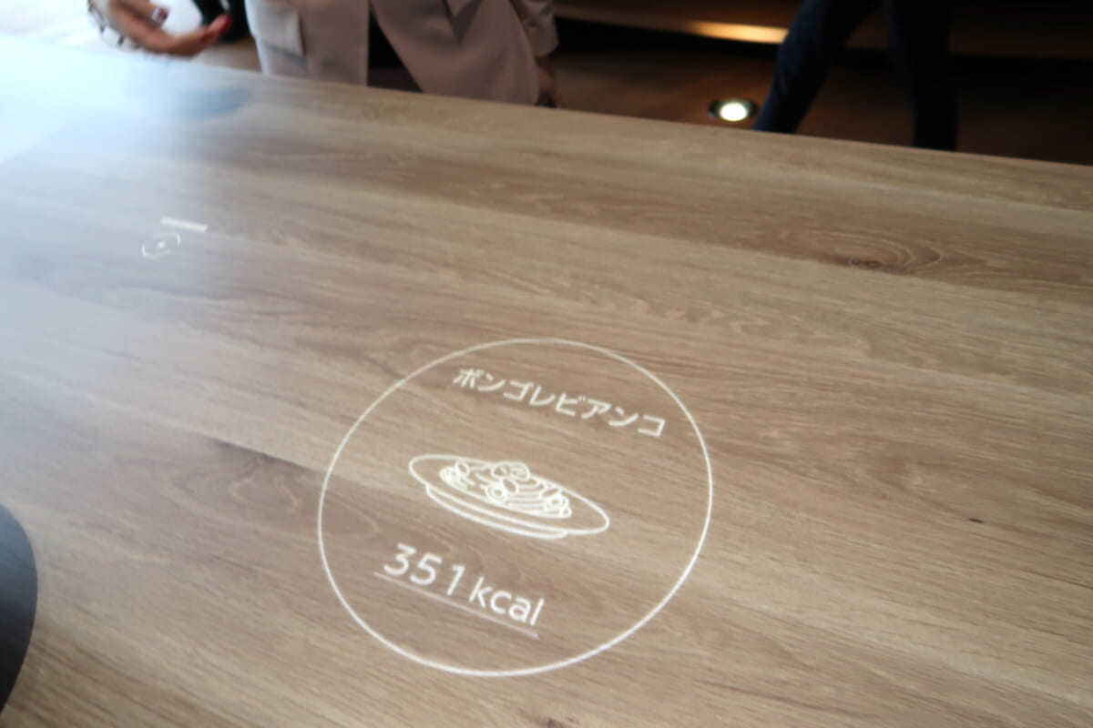 さらに、パナソニックと共同開発した、お皿のICチップに反応してカロリーなどエネルギー情報がアニメーションでテーブル天板に流れる「インタラクティブテーブル」など。食事だけでなく目でも楽しめるハイテク体験でお客さんをおもてなしします。
