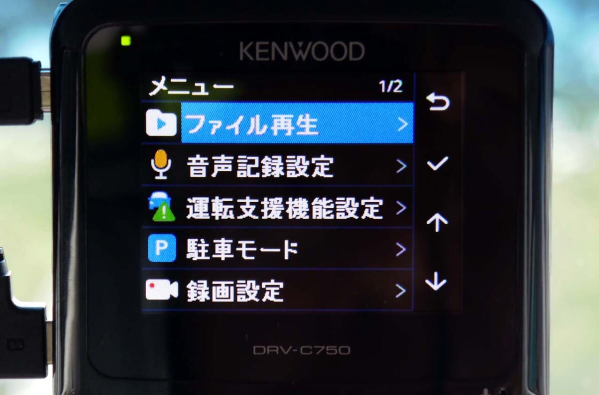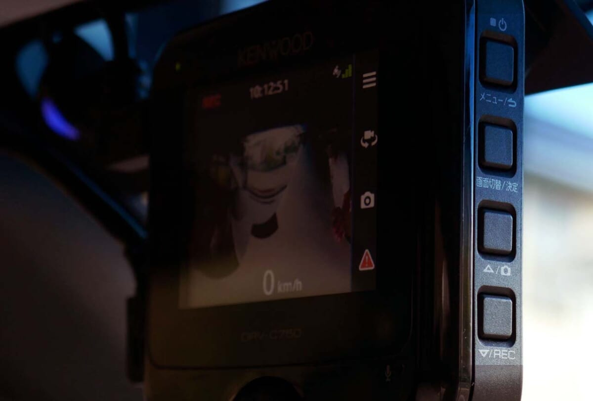 各設定は右サイドに並んだスイッチによって行います。メニューはケンウッドらしい分かりやすい構成となっており、階層も深くないので各種設定で迷うことは少ないと思います。静止画撮影ボタンや手動撮影(イベント撮影)ボタンも右側面にあり、思いついたときにすぐに押せるのは使いやすかったですね。またデフォルトでは、ディスプレイがONになると設定したモードで撮影した映像がモニターされますが、設定をOFFにすることも可能です。