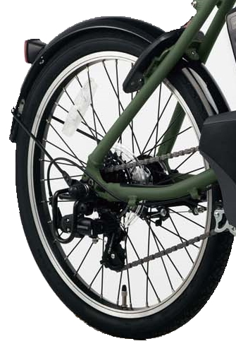 20型の小径モデル。スポーティなダイヤモンド型フレームには、転倒した際にフレームを守るリプレーサブルエンドを採用する。カラバリには艶消しのマットオリーブも用意されるなど、年齢や性別を問わないデザインだ。前後に泥除けが装備されているため、通勤時でも安心して乗れる。