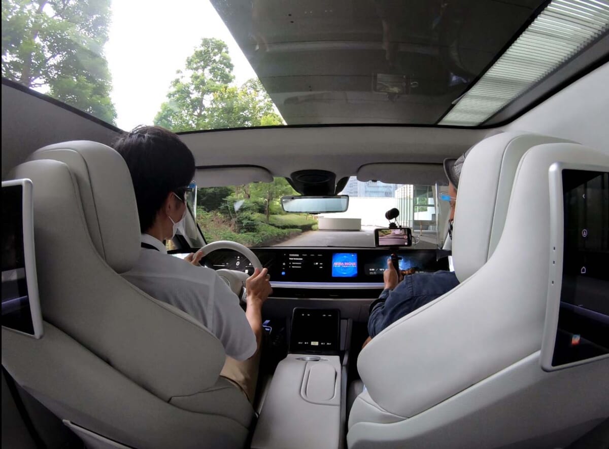 そして、いよいよ試乗。この日はナンバーが取得できていないためにソニー本社の敷地内で実施されました。走行した場所は石畳が続いており、走る条件としてはプロトタイプの車両には少々きつい条件。それでもVISION-SはEVらしくスムーズにスタートし、ステアリングを切ってもしっかりとした感じが伝わってきました。一方で、ドアを閉める音や走行中に各所から響いてくるギシギシ音はプロトタイプであることを実感させましたが、内装の造り込みは半端じゃなく上質。それだけでの居心地の良さを感じさせてくれるものでした。