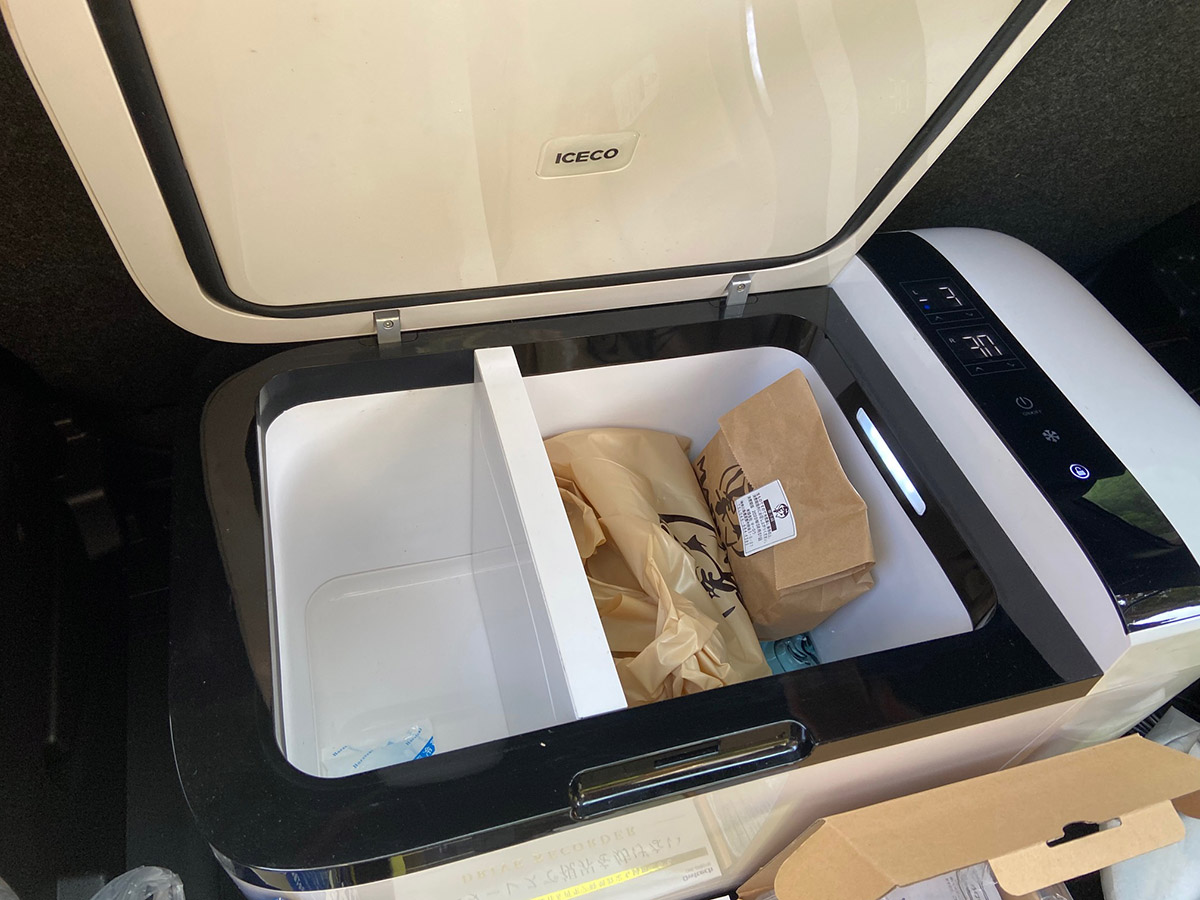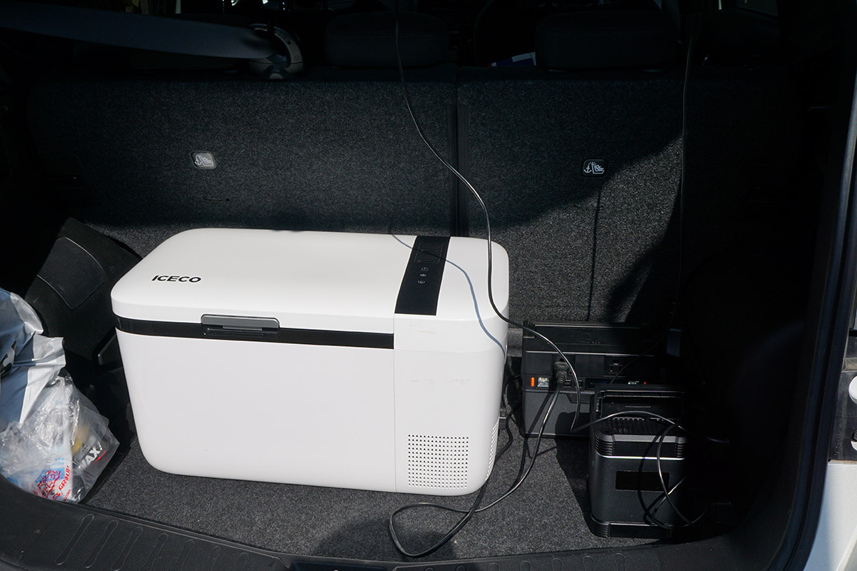 このICECOはAC電源か車載シガーソケットから給電可能なのですが、ポータブル電源を組み合わせることで、屋外やキャンプなどでも使うことができます。ちなみに、バッテリー容量100,500mAhの「LPBL100501」で、ICECOの冷蔵モードが約5時間半使用できました。このICECOがあれば、お刺身などの生モノも冷たいまま持ち帰ることができますね。