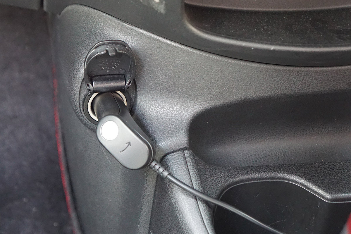 続いて、シガーソケットから給電するための電源コードを設置します。コードは車内の内装のすきまに埋め込むようにして隠しながらとり回していきましょう。下まで来たら、フロアカーペットの下を通して、運転の邪魔にならないようにします。
