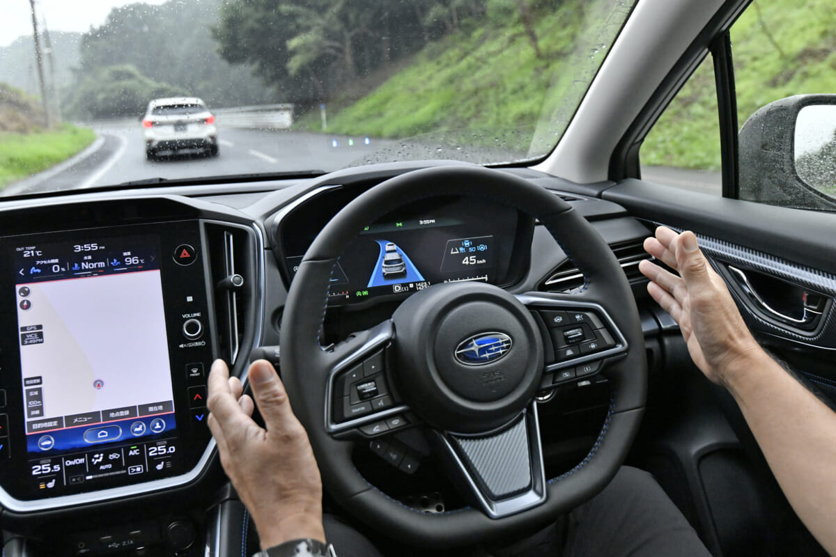 アイサイトXでは、24GHzのマイクロ波レーダーを使った「アクティブレーンチェンジアシスト」も搭載されました。ドライバーがレーンチェンジをしようとウインカーを操作すると、レーダーが斜め後方の車両の存在を検知。システムが安全と判断すると自動的にレーンチェンジへと移行します。この時ドライバーはステアリングに軽く手を添えておけばOK。レーンチェンジが完了すればウインカーは自動的に停止します。このメリットは公道でぜひ試してみたいですね。