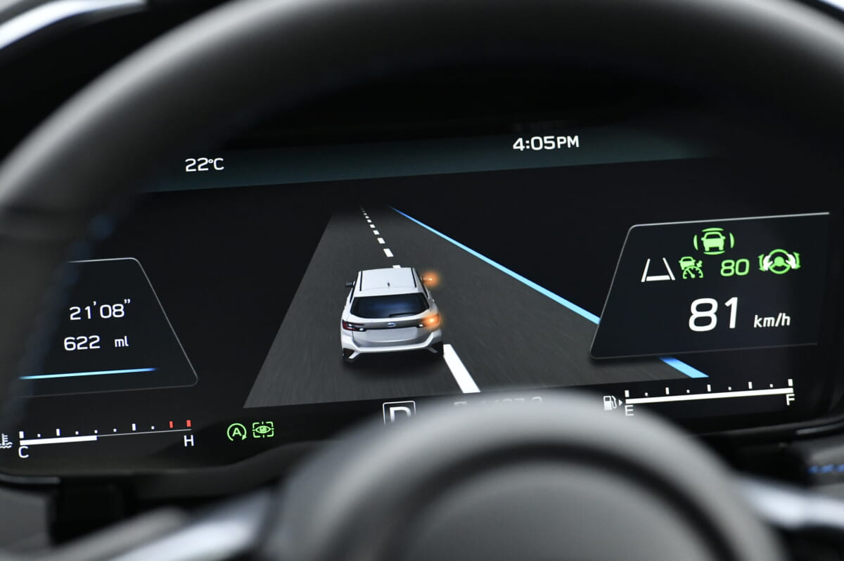 加えて新型レヴォーグでは「アイサイトX」と呼ばれる+35万円のオプションも用意しています。準天頂衛星「みちびき」やGPSから得られる情報と3D高精度地図データを利用することで、より高度な運転支援機能が上乗せされるパッケージです。その中にはナビ機能など3つの表示モードを備えるフル液晶パネルメーターも含まれます。しかし、中でももっともインパクトある機能と言えるのが“渋滞時ハンズオフアシスト”でしょう。これは約50km/h以下の渋滞時になるとステアリングから手を離しても先行車に自動追従する機能です。