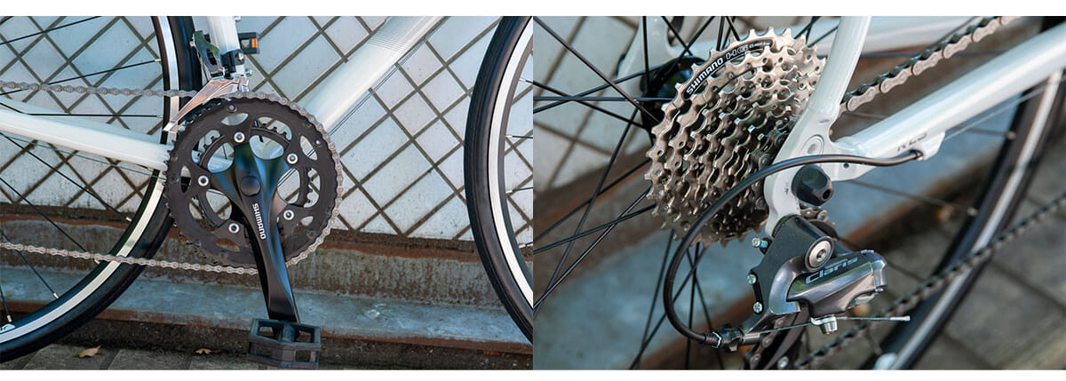 ●適正身長:146㎝以上 ●シフト段数:フロント2段×リア8段 ●メインコンポーネント:シマノ ソラ/クラリス(試乗車はクラリス) ●タイヤサイズ:700×28C ●重量:10.1kg(490mm、クラリス搭載モデル)
