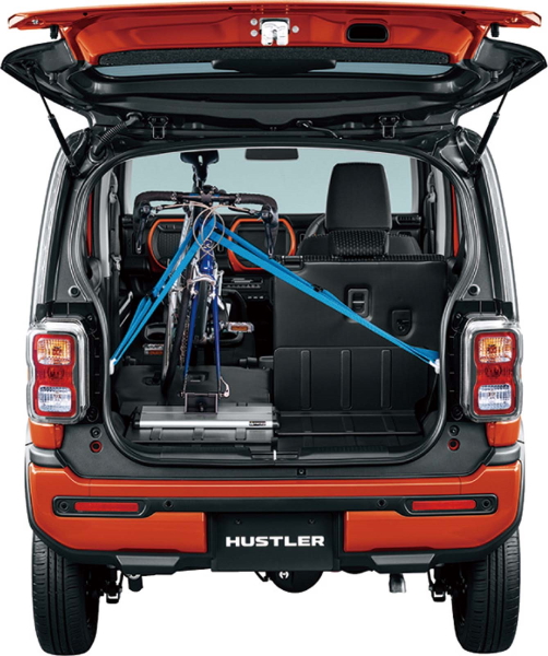 アウトドアを遊び尽くせるようサイクルキャリアやベルトもオプションで用意される。限られた空間でも工夫次第で楽しみ方は無限大。