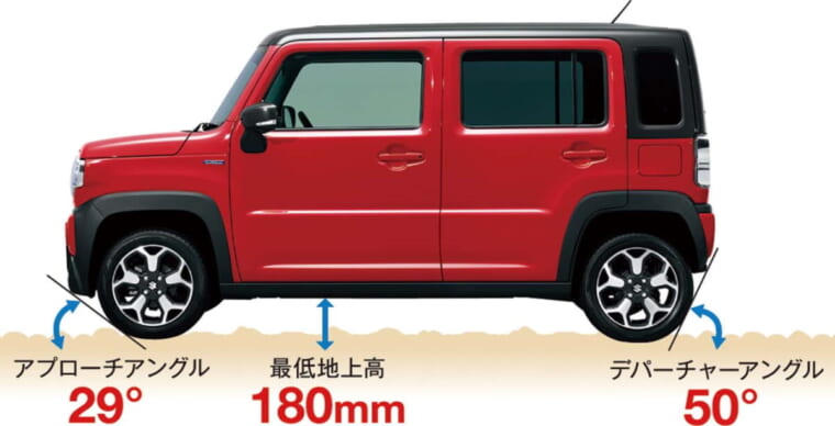 全モデル地上最低高は180mmと高く設定され、急坂にも十分対応できる前後のアングルを確保する4WDならばより高い走破性を実現している。