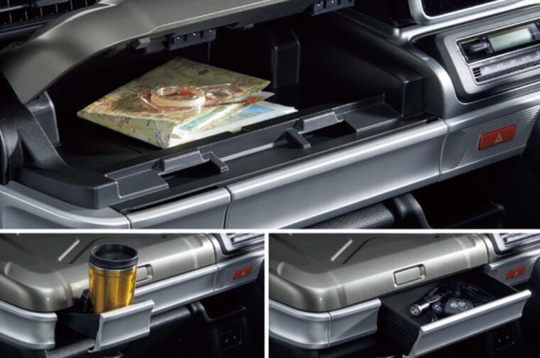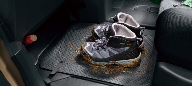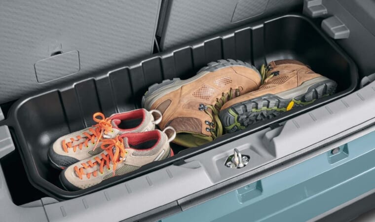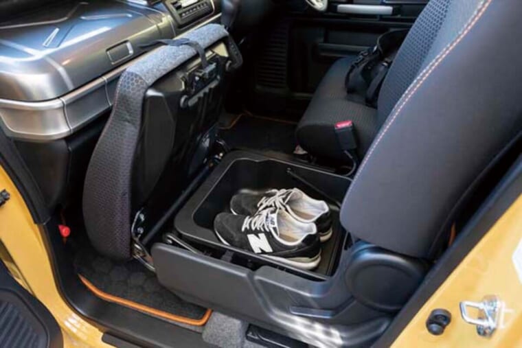 助手席座面下にも靴などが入れられる収納スペースを装備。樹脂性なので汚れに強く、持ち出して洗うこともできる。