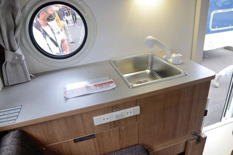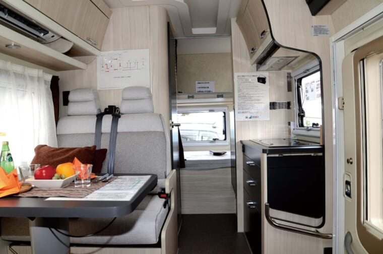 大人でも立てるほどの室内高が、余裕ある居住スペースを生んでいる車内。コンパクトでありながら必要十分な機能を備えるギャレーも完備。