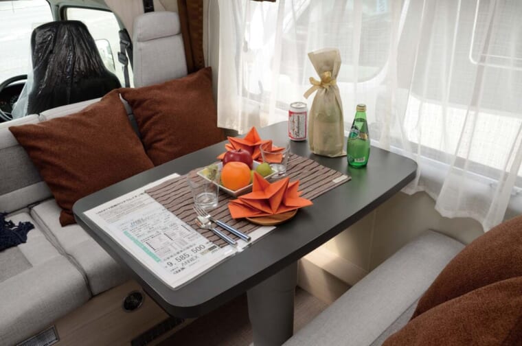 ダイネットには向かい合わせのシートが置かれ、会話も弾む。伸縮式のテーブルを下げてシートを転換すれば、1800×900mmのベッドになる。