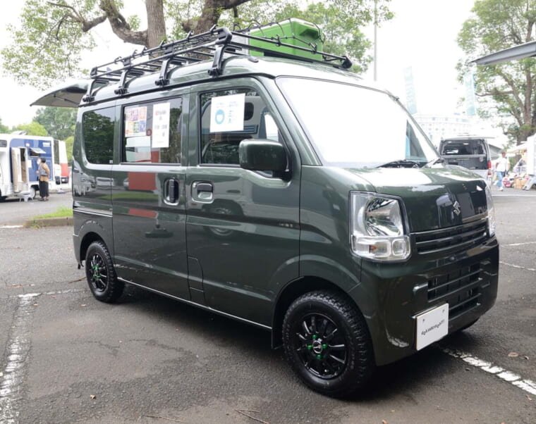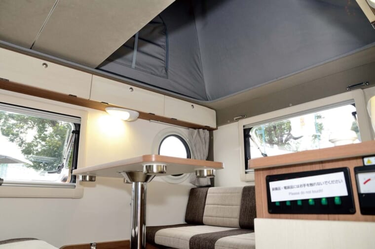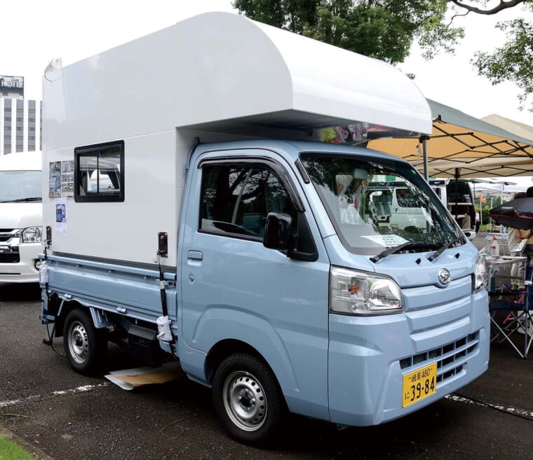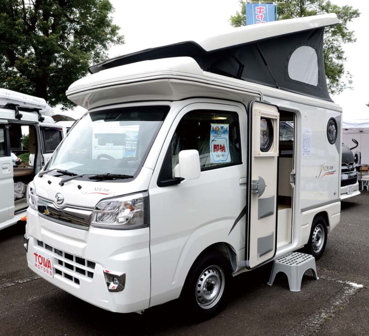 ベース車両はハイゼット トラック。ポップアップ式のルーフベッドを備えるなど大型キャンパー並みの快適装備が満載。