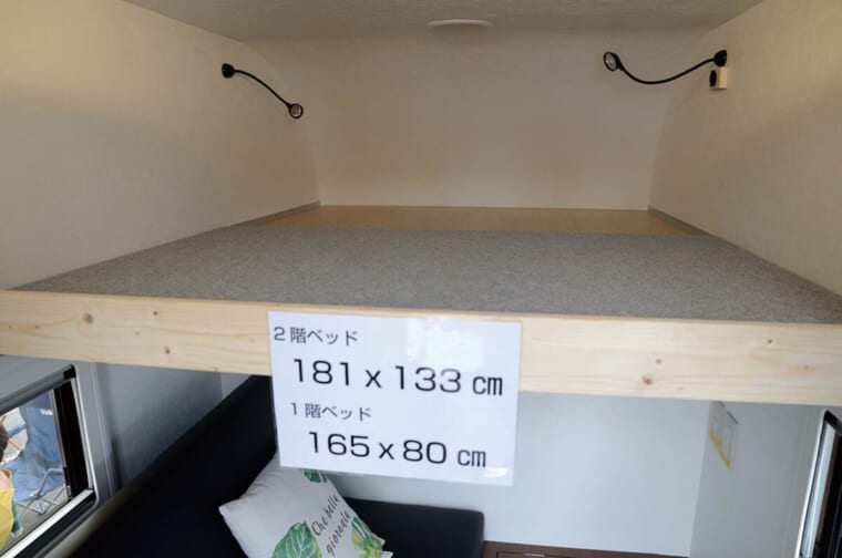 前方には就寝時に引き出して使うバンクベッドを装備。拡張時のベッドサイズは1940×1740mmで、大人2人が余裕で横になれるサイズだ。