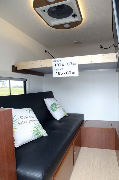 7人が前向きで乗車できるので日常的な使い勝手も抜群。後部を2段ベッドにすることで大人3人が就寝することが可能。