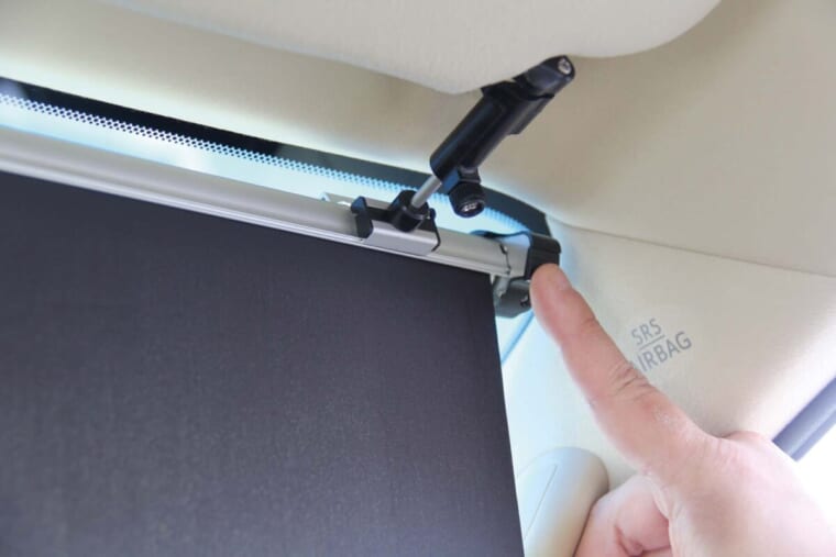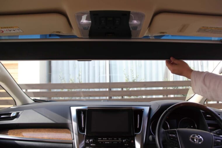 炎天下に停める際の必需品でもあるフロントのサンシェードだが、着脱や収納は結構面倒。シンシェードならサンバイザーの金具に常時取り付けた状態で、使用時は引っ張るだけでOK。収納はボタンひと押しで完了する。